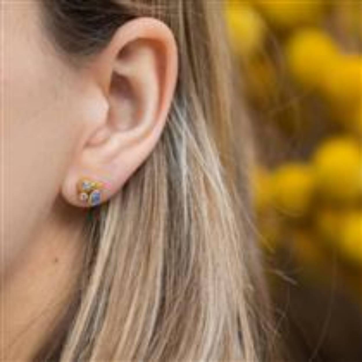 Deze geel goud vergulde oorknoppen bevatten een 5 x 3 mm maansteen, een 5 x 3 mm gefacetteerde blauwe topaas, een 2 mm ronde gefacetteerde blauwe topaas en een 1,5 mm ronde zirkonia.