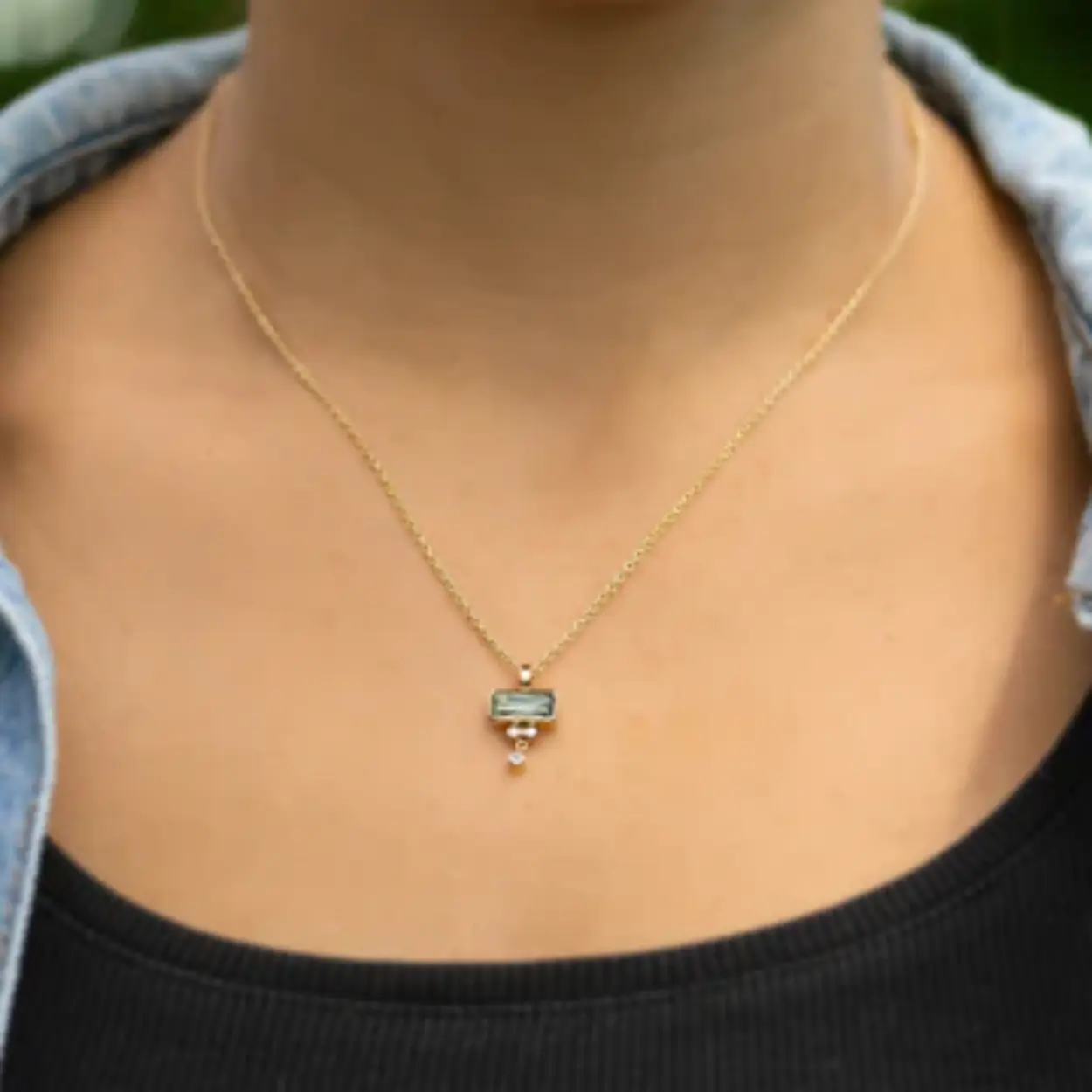 Deze geel goud vergulde ketting heeft een prachtige hanger met een 10 x 4 mm blauwe kwarts octagon facetgeslepen, een 2 mm ronde blauwe topaas en twee 1,5 mm ronde zirkonia's. De ketting kan zowel op 42 cm als 45 cm gedragen worden.
