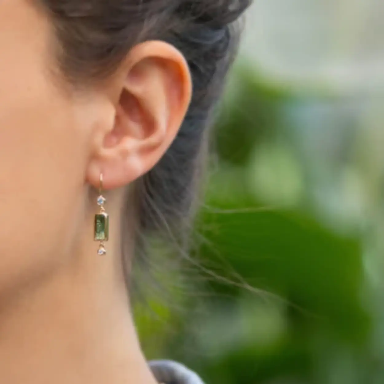 Deze geel goud vergulde oorbellen bevatten elk een 10 x 4 mm blauwe kwarts octagon facetgeslepen, een ronde 2,5 mm blauwe topaas en een 2 mm ronde zirkonia. De lengte van de oorbellen is +/- 2,3 cm