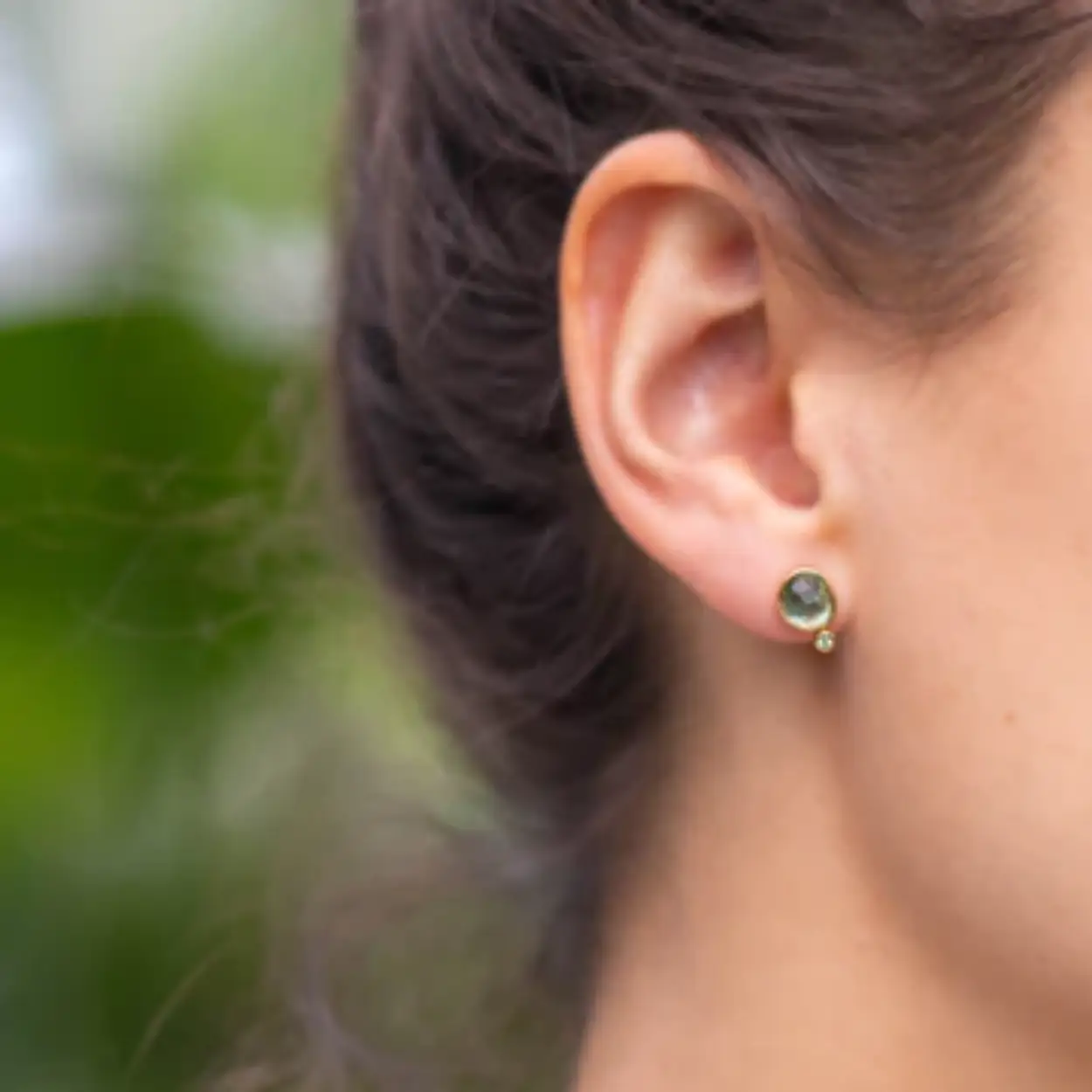 Deze geel goud vergulde oorknoppen hebben beide een 7 x 6 mm roosgeslepen niervormige blauwe kwarts en een 2 mm ronde gefacetteerde peridoot. De doorsnede van de oorknoppen zijn +/- 1 cm.