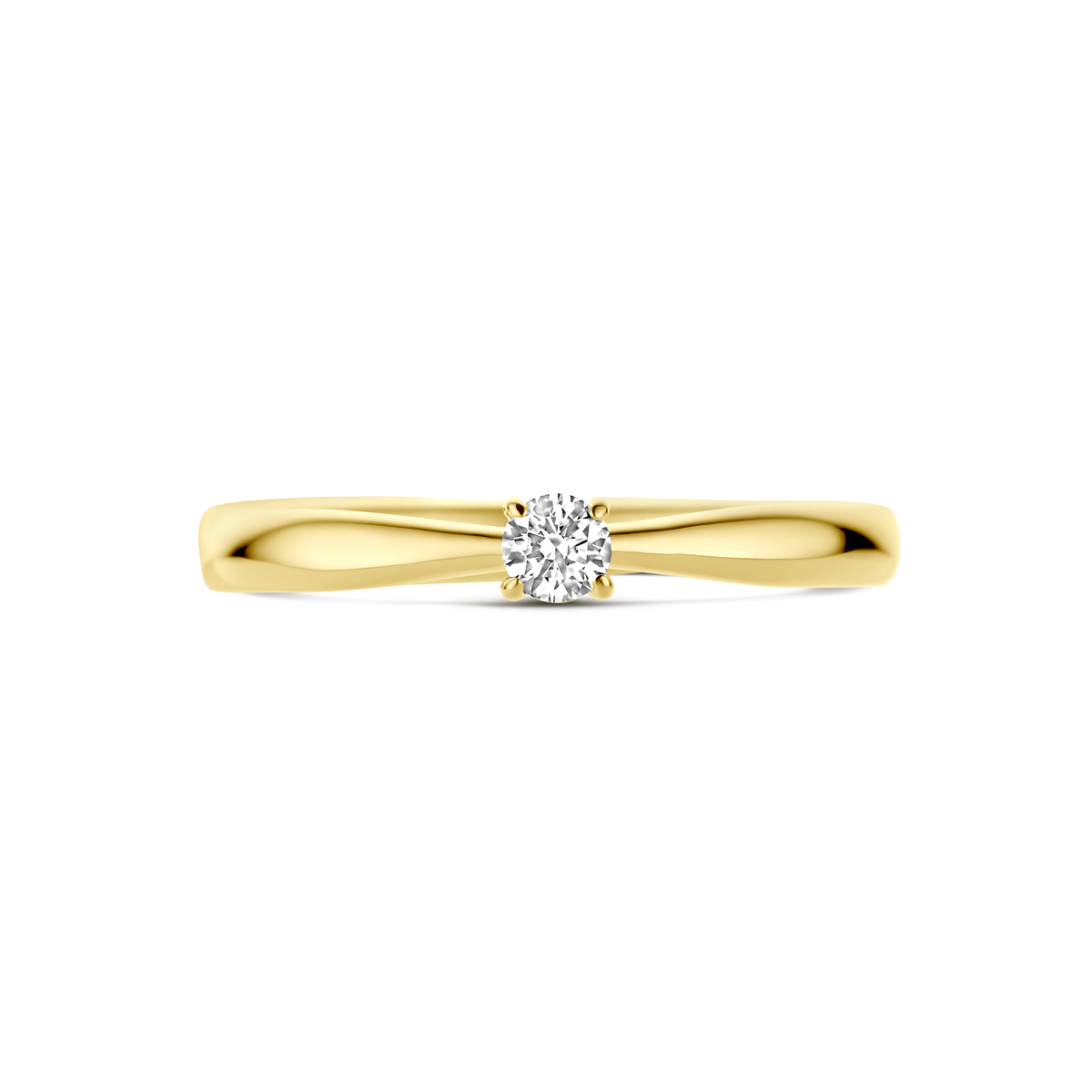 14k Geelgouden aanzoeksring uitgevoerd met diamant. De steenmaat is 3mm en het diamantgewicht is 0.10ct.