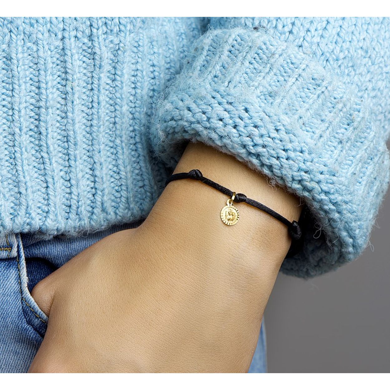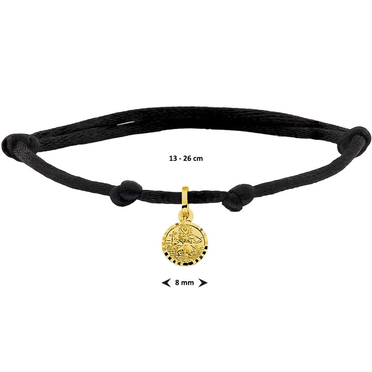 Zwart gevlochten armband met 14k geelgouden christoffel hanger. De armband heeft draaglengtes van 13 tot 26cm. De hanger heeft een breedte van 8mm.