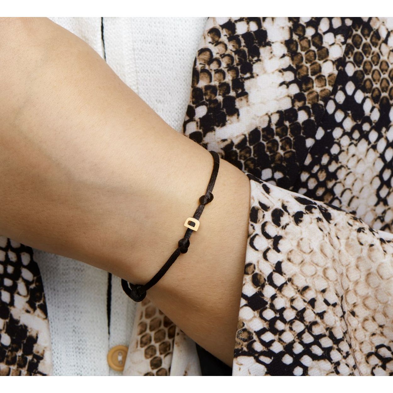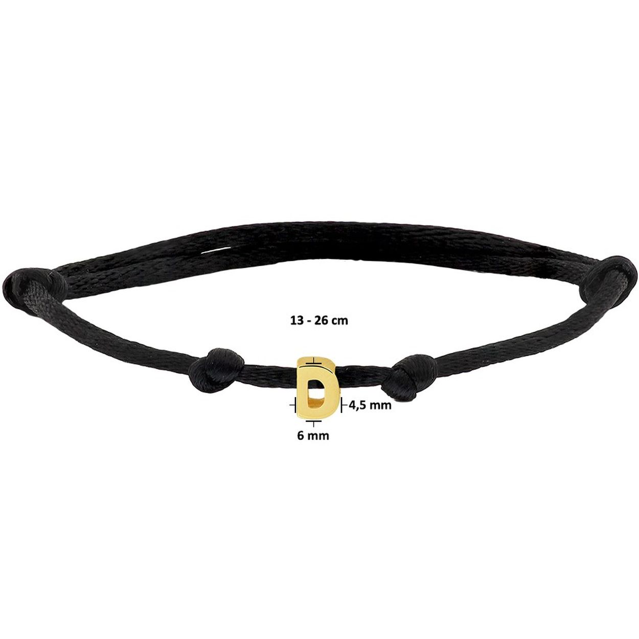 Zwart gevlochten armband uitgevoerd met een 14k geelgouden letter D. De armband heeft draaglengtes van 13 tot 26cm. De letter heeft een afmeting van 6x4.5mm.