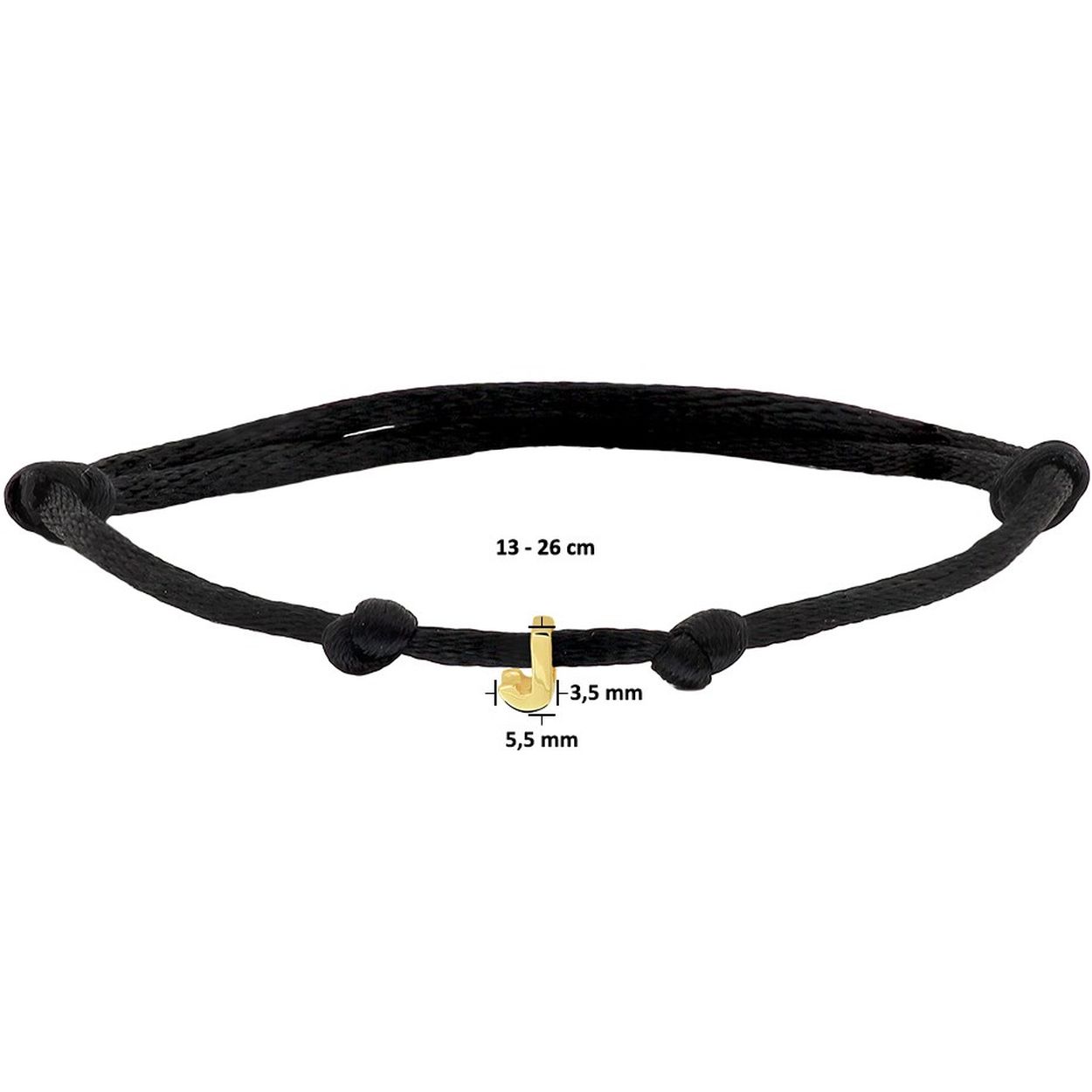 Zwart gevlochten armband uitgevoerd met een 14k geelgouden letter J. De armband heeft draaglengtes van 13 tot 26cm. De letter heeft een afmeting van 5.5x3.5mm.