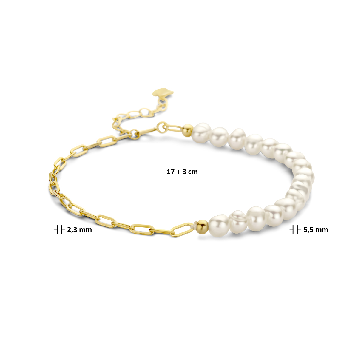 Geelgoud op 925 zilveren armband uitgevoerd met zoetwaterparels van 5.5mm en een paperclip schakel van 2.3mm. De armband heeft een draaglengte van 17cm en een extensie van 3cm. Geen garantie op plating.