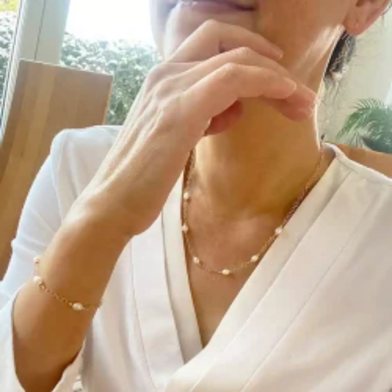 Armband & ketting met 6 wit/ovale zoetwaterparels + 2 stuks 14kt bollen & windingen per parel, wat de kettingen een extra elegantie geeft.