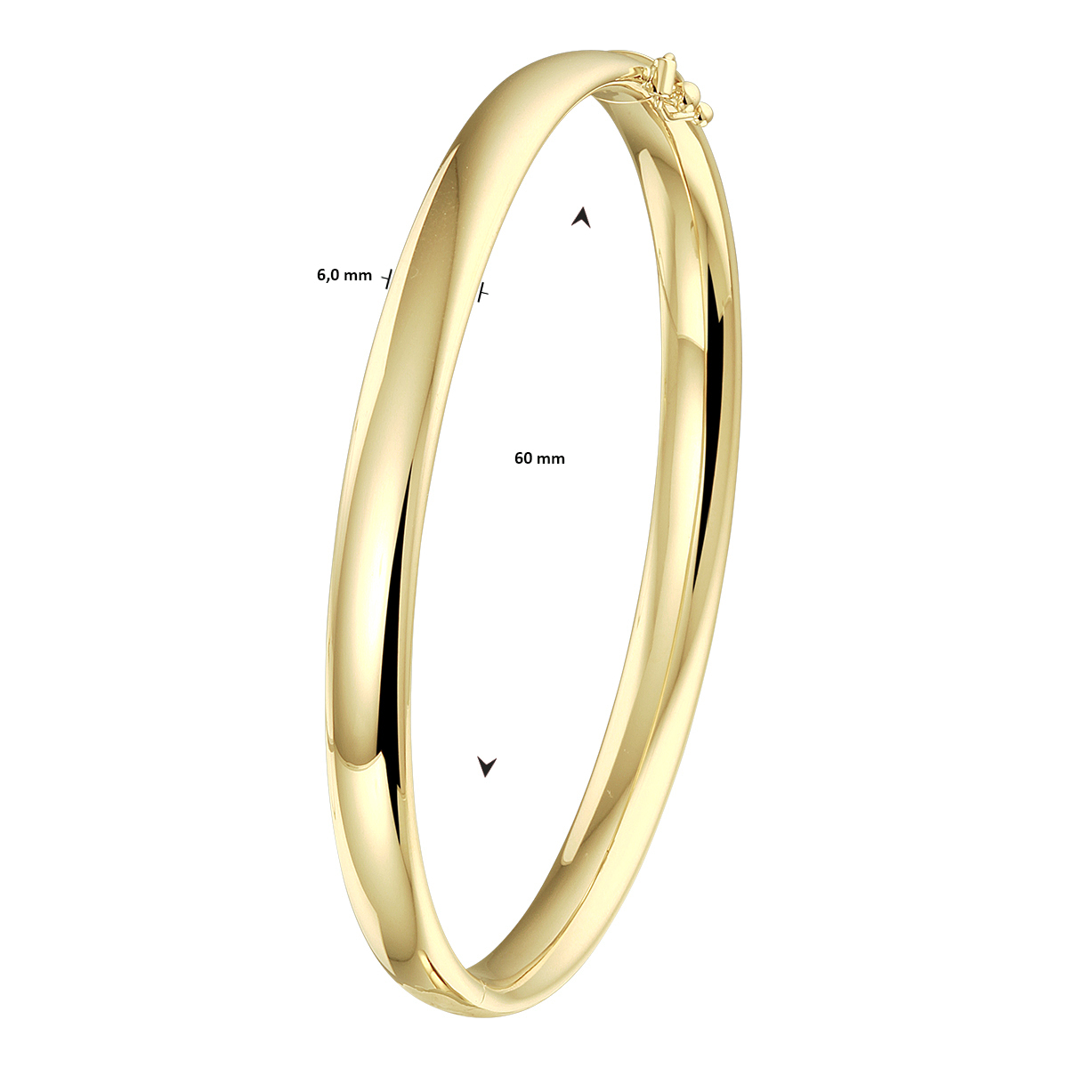 14k Geelgouden bangle uitgevoerd met een scharnier. De bangle heeft een breedte van 6mm en een binnendiameter van 60mm.