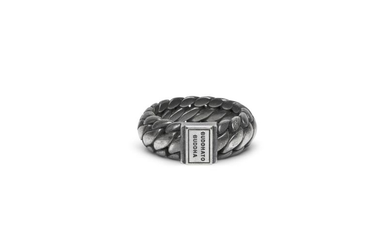 Het ontwerp van de Ben Small ring is aangepast met een unieke matte rhodium finishing en gepolijste zilveren details.