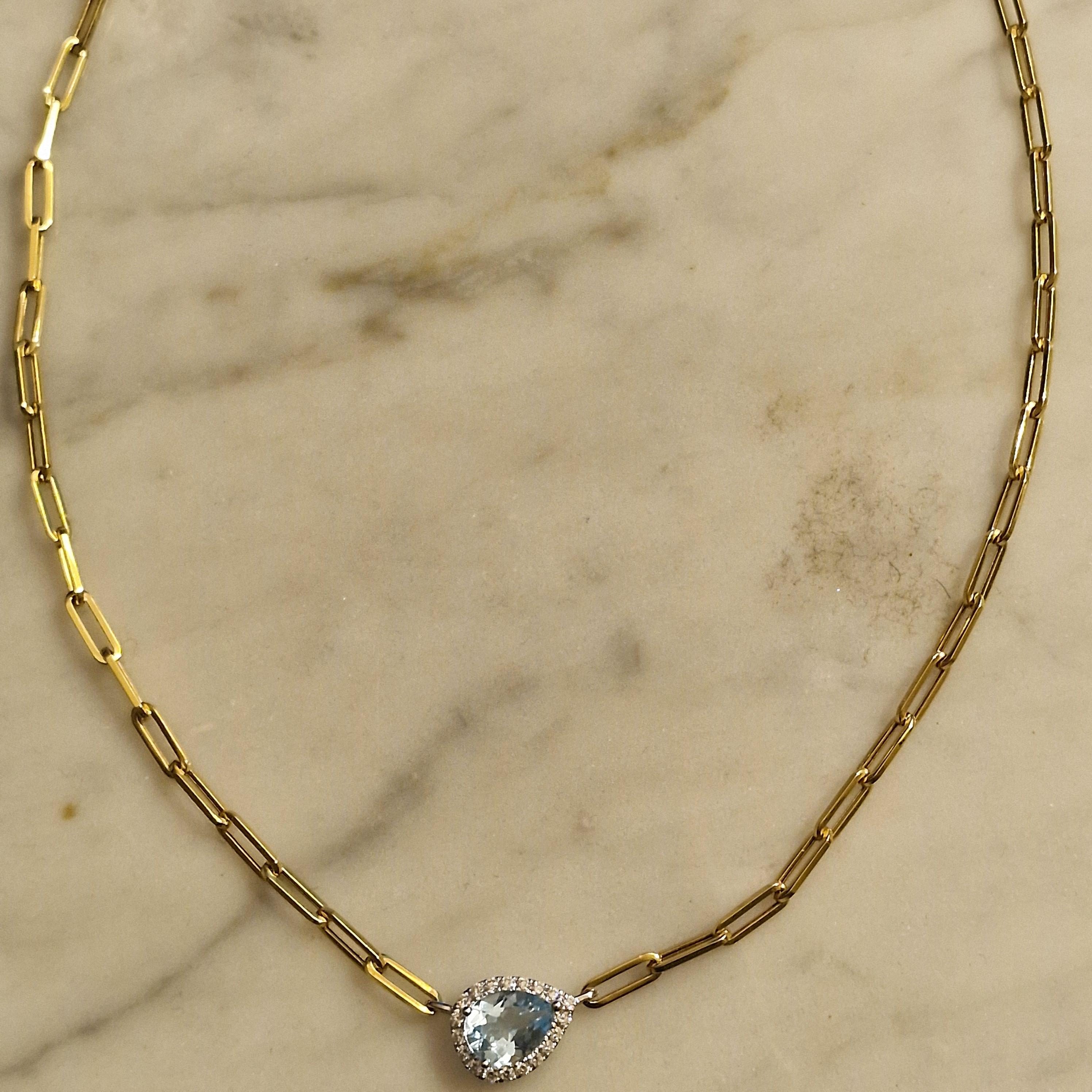 18k geelgoud paperclip collier 42 cm met een witgouden peervormige diamant entourage hanger met blauwe topaas