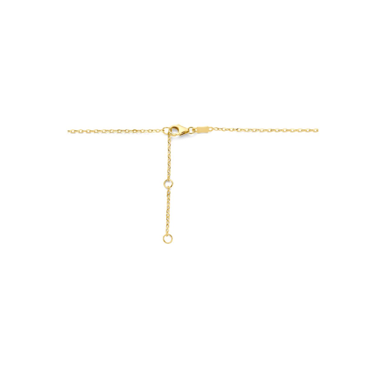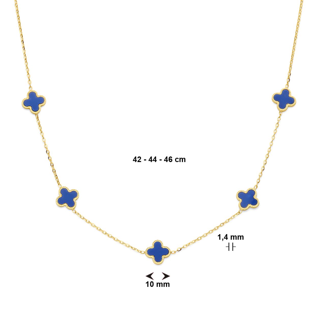14k Geelgouden collier uitgevoerd met een bloem, lapis en een karabijn sluiting. Het collier heeft draaglengtes van 42, 44 en 46cm. De schakelbreedte is 1.4mm.