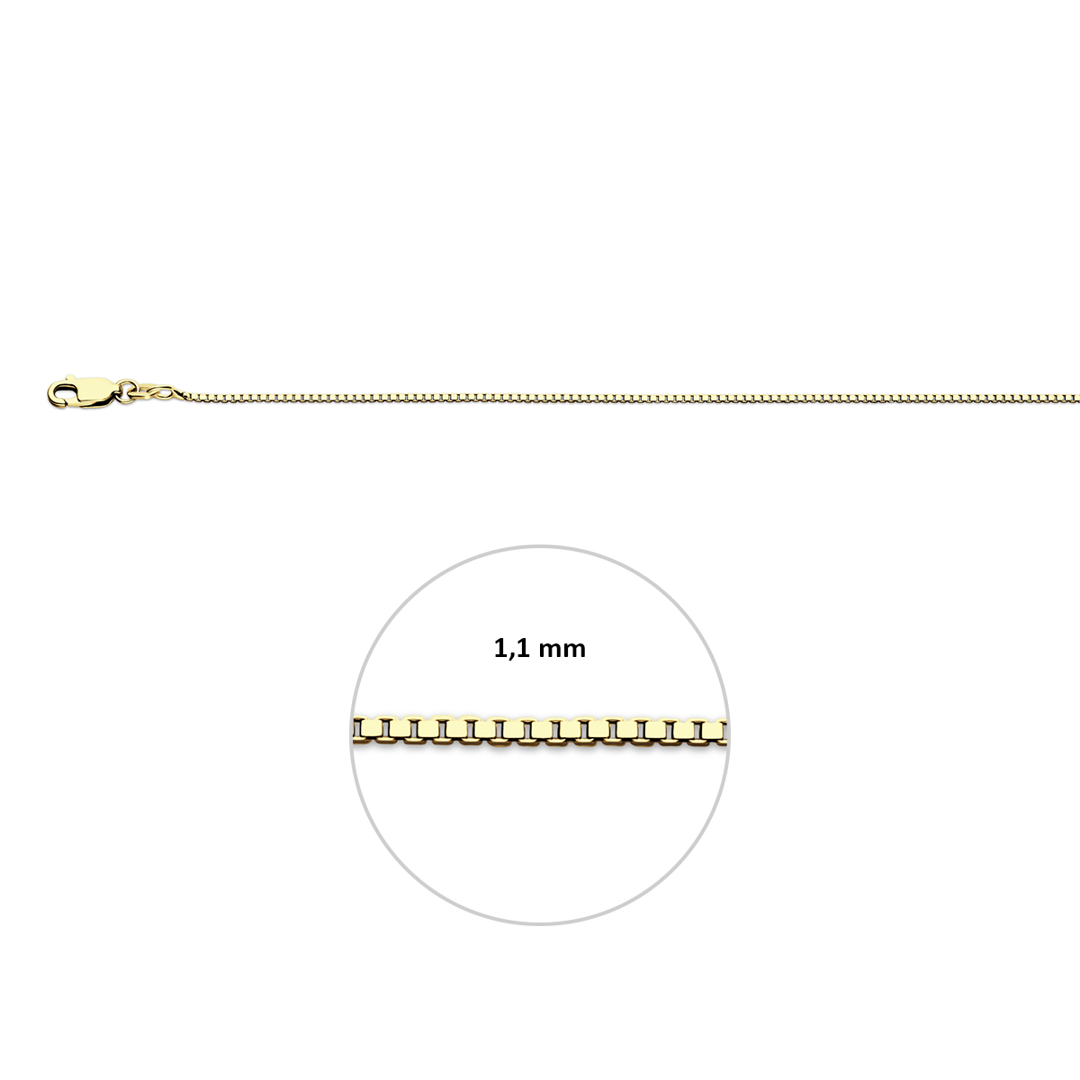 Verguld op 925 zilveren collier. De schakelbreedte is 1.1mm. Het collier heeft een draaglengte van 41cm en een extensie van 4cm. Uitgevoerd met een karabijn sluiting. Geen garantie op plating.