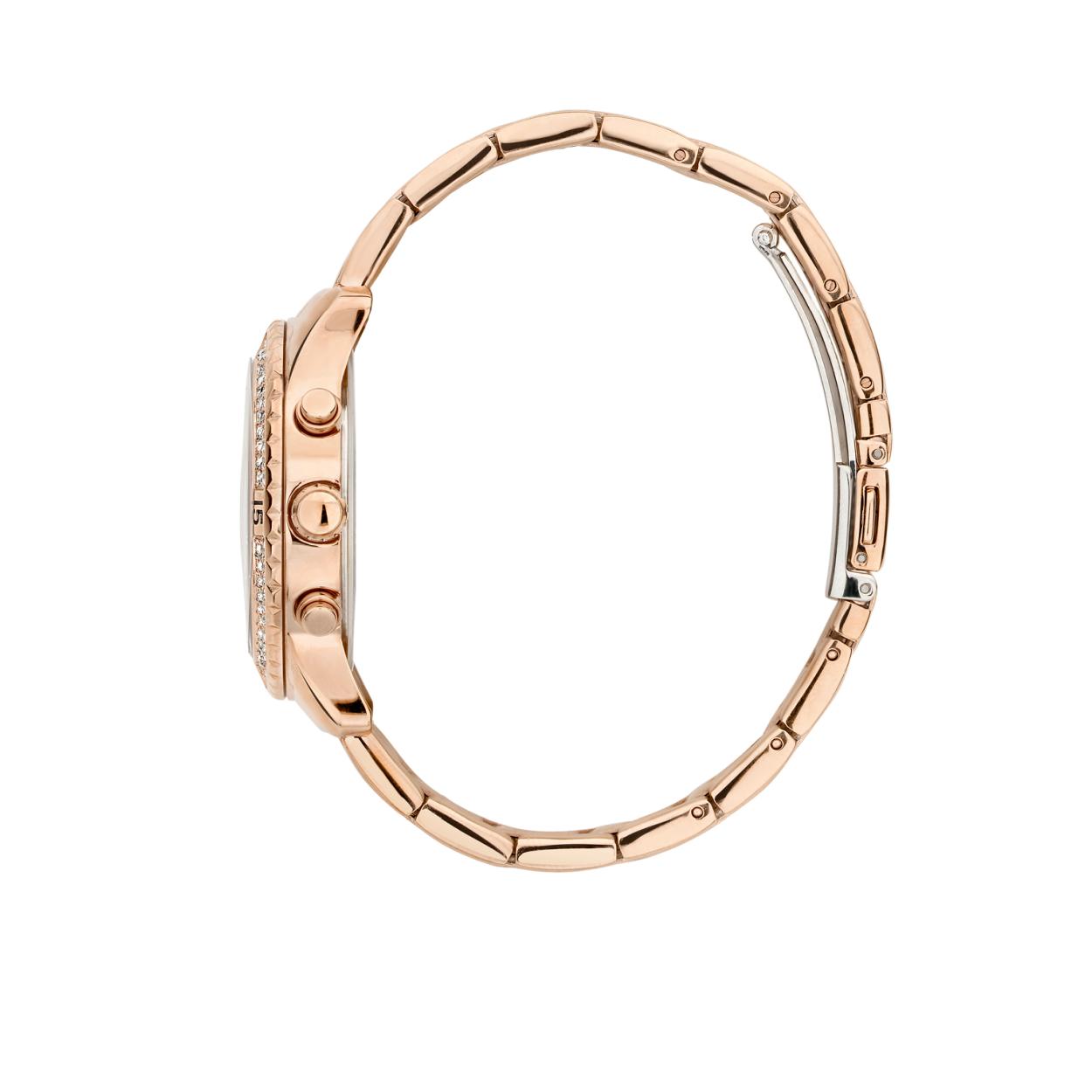 Het rosegouden GUESS Confetti dameshorloge heeft een roze met gouden glitterwijzerplaat en is afgezet met een chrystal lunet. Deze party watch met een 38 mm kast heeft een chronolook en steentjes als tijdsindicatie. De schakelband heeft een kliksluiting. Model: W0774L3
