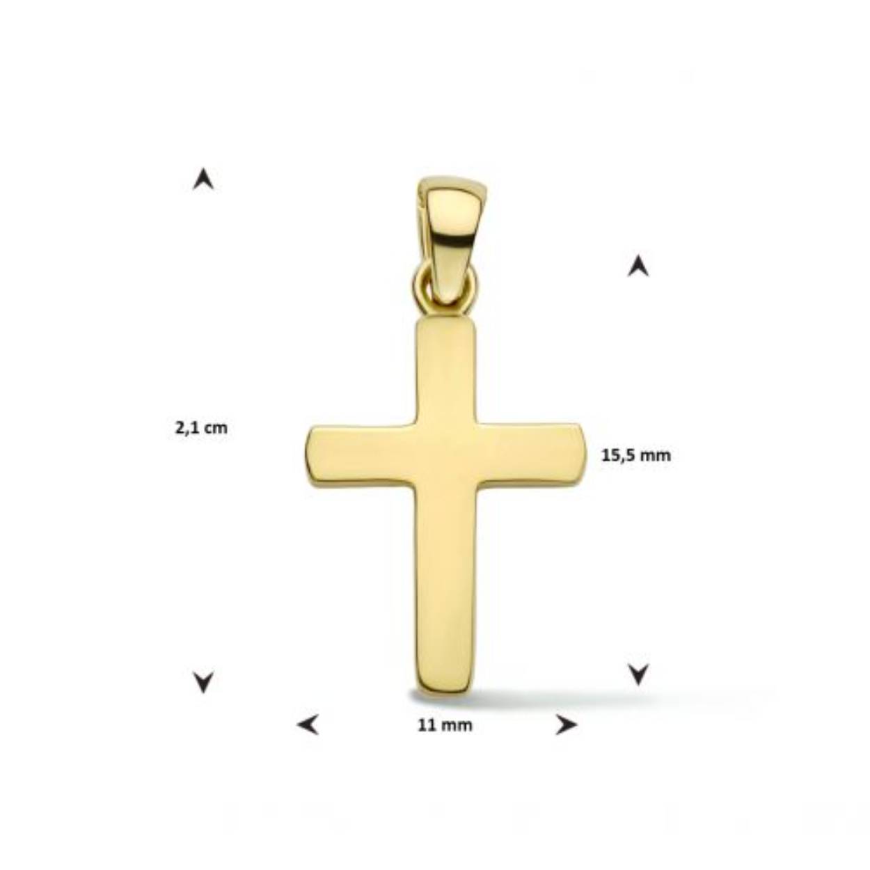 14k Geelgouden hanger uitgevoerd in de vorm van een kruis. Het kruis heeft een afmeting van 15.5x11mm.