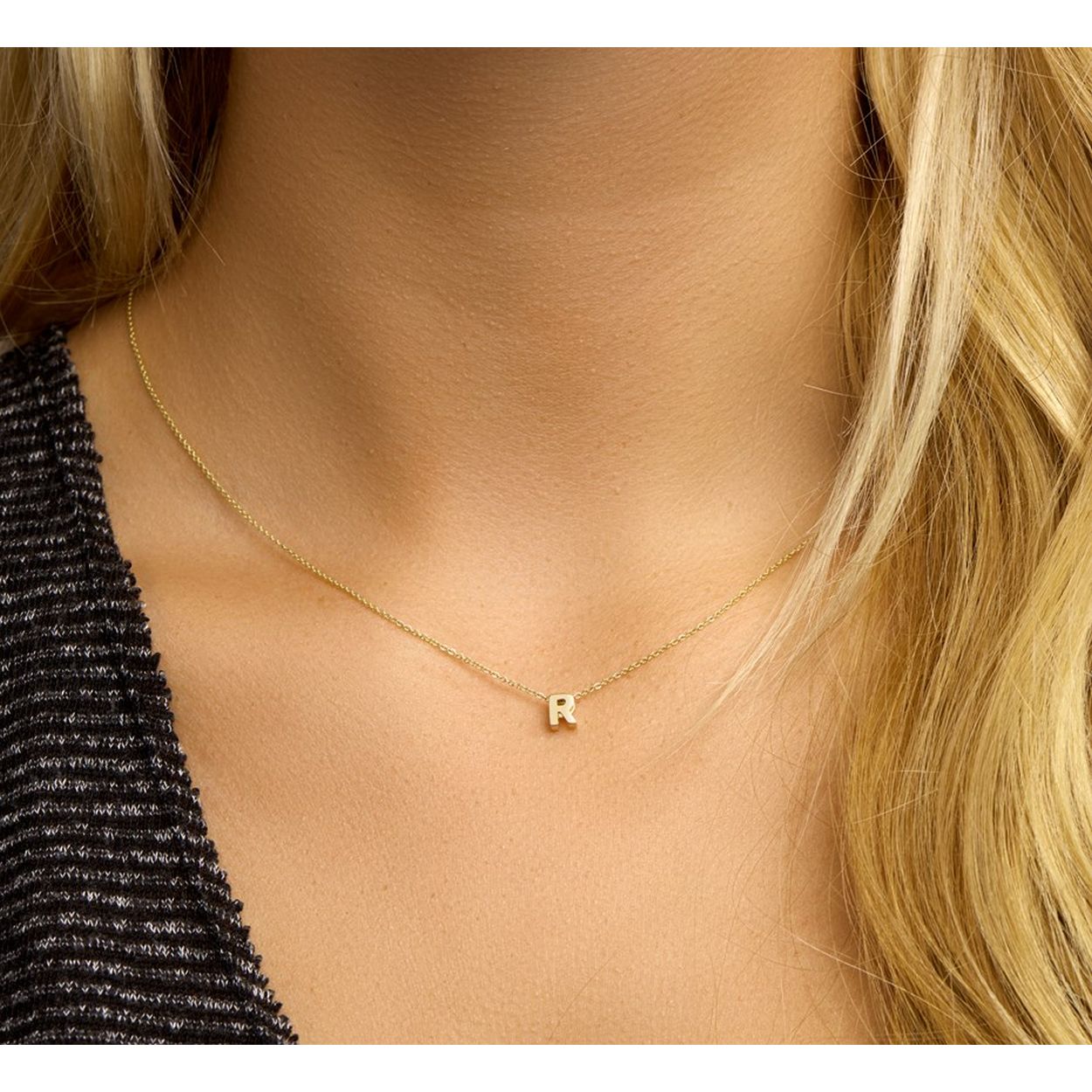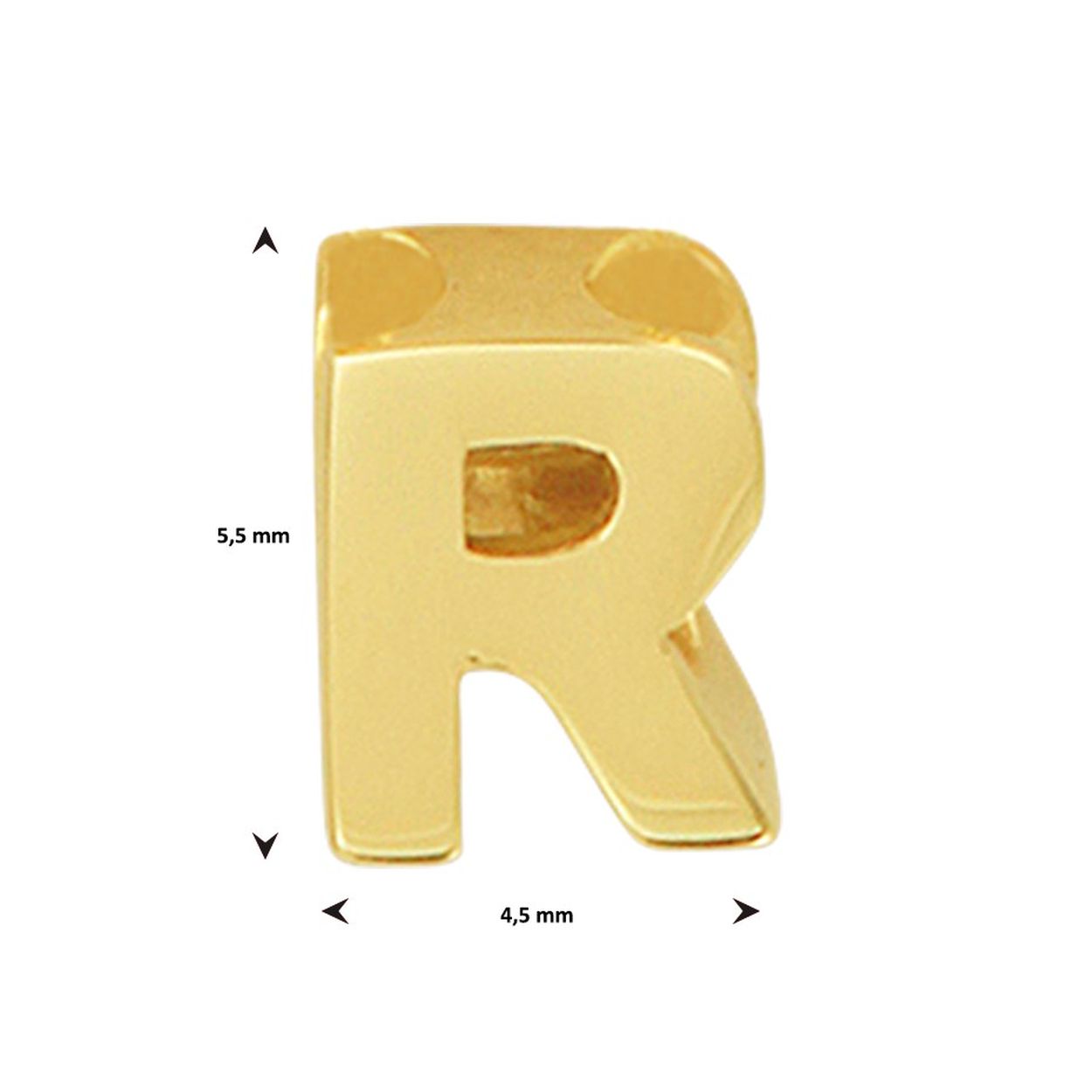 14k Geelgouden hanger uitgevoerd in de letter R. De hanger heeft een afmeting van 5.5x4.5mm.