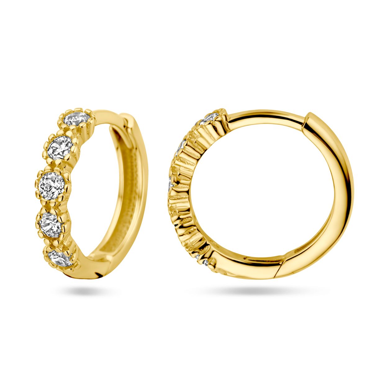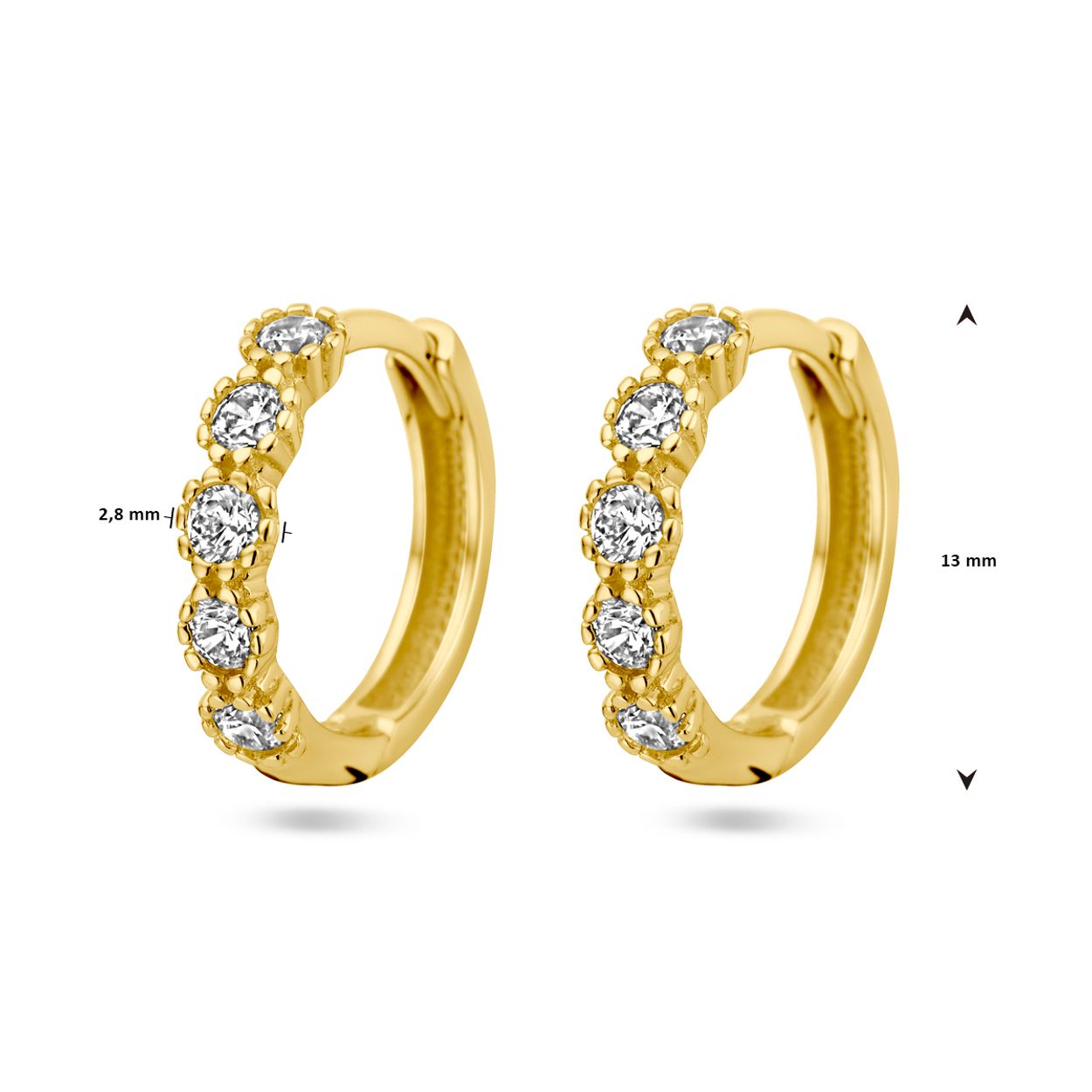 14k Geelgouden klapoorringen uitgevoerd met zirkonia. De klapoorringen hebben een afmeting van 13x2.8mm.