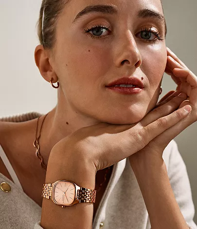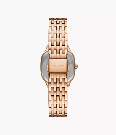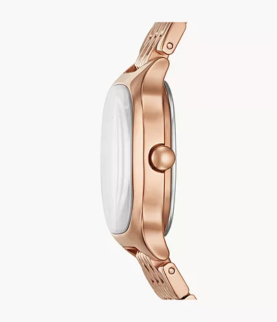Dit roségoud kleurige roestvrijstalen horloge is verfijnd en modern en maakt een onderscheidend statement. De vierkante kast van 28 mm met afgeronde hoeken heeft een goudkleurige sunray-wijzerplaat en een uurwerk met drie wijzers.