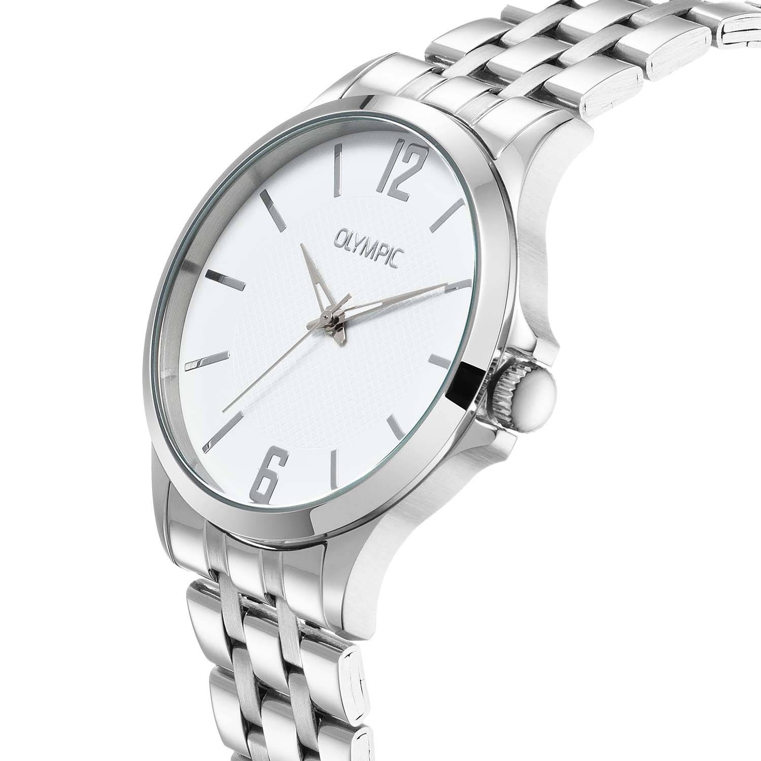 Dit unieke Olympic horloge met artikelnummer: OL72HSS402 is een herenhorloge met een classic sportieve uitstraling. Het horloge heeft een ronde stalen kast met een witte wijzerplaat met de 12 en de 6 en streepjes. Aan de kast zit een zilverkleurige stalen schakelband met vouwsluiting. Het horloge heeft een mineraalglas, een doorsnee van 40mm en is 5ATM.