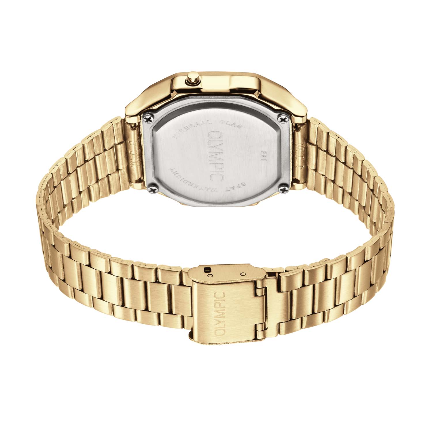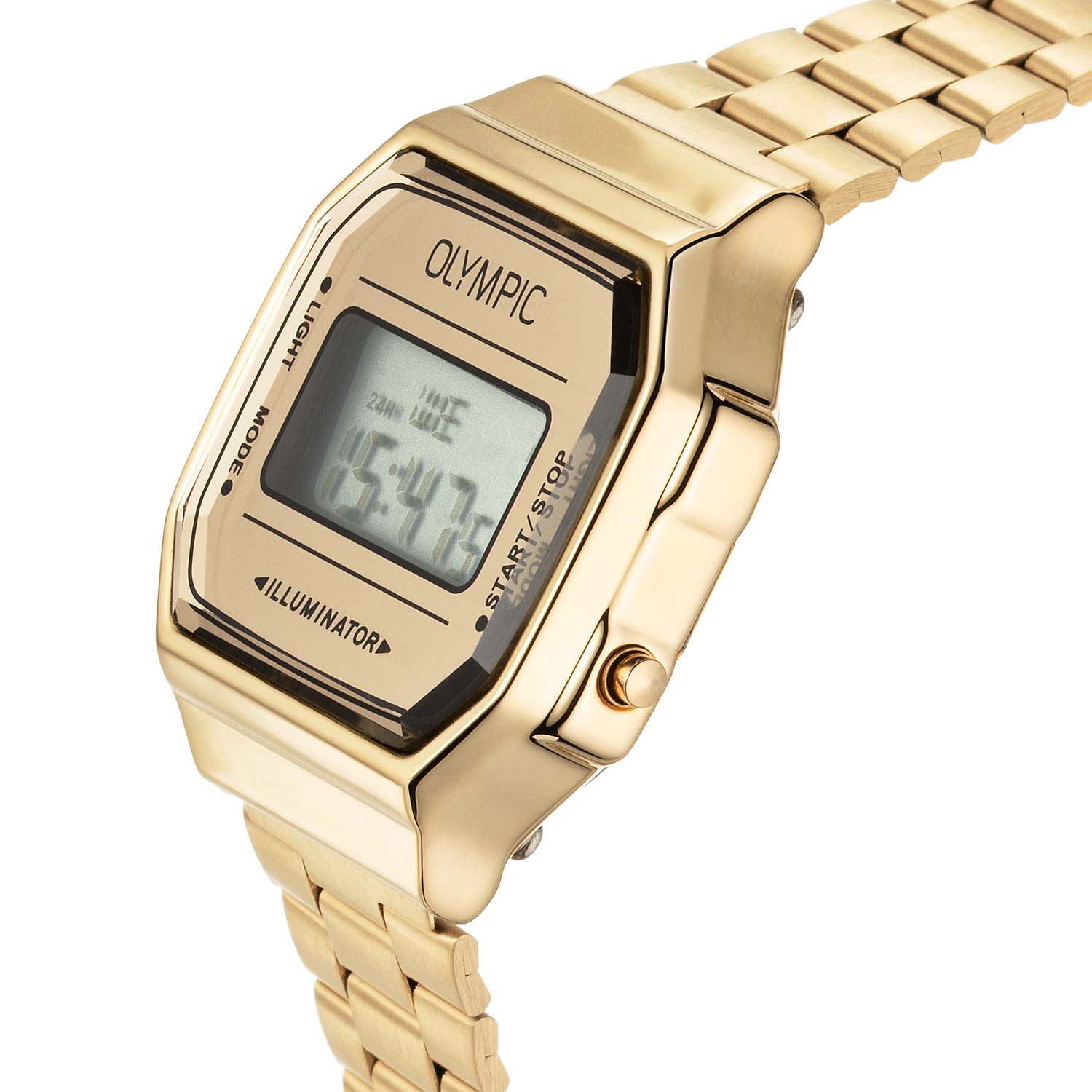 Dit unieke Olympic horloge met artikelnummer: OL66HKS003 is een digitaal horloge met een sportieve uitstraling. Het horloge heeft een rechthoekige goudkleurige metalen kast met een goudkleurig digitaal venster met zwarte accenten. Het horloge heeft meerdere functies zoals, tijd, datum, stopwatch, alarm en verlichting. Aan de kast zit een goudkleurige stalen matte schakelband met kliksluiting. Het horloge heeft een mineraalglas, een afmeting van 38,6x 36,3mm en is 3ATM.