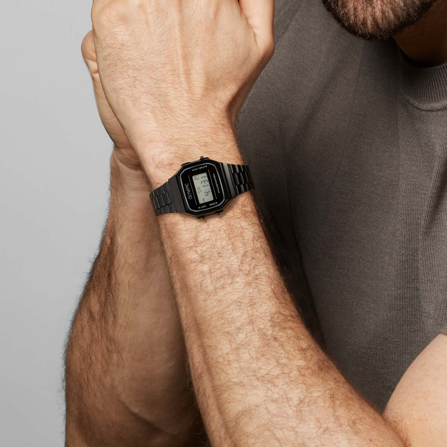 Dit unieke Olympic horloge met artikelnummer: OL66HKS004 is een digitaal horloge met een sportieve uitstraling. Het horloge heeft een rechthoekige zwarte metalen kast met een zwart digitaal venster met witte accenten. Het horloge heeft meerdere functies zoals, tijd, datum, stopwatch, alarm en verlichting. Aan de kast zit een zwarte stalen matte schakelband met kliksluiting. Het horloge heeft een mineraalglas, een afmeting van 38,6x 36,3mm en is 3ATM.