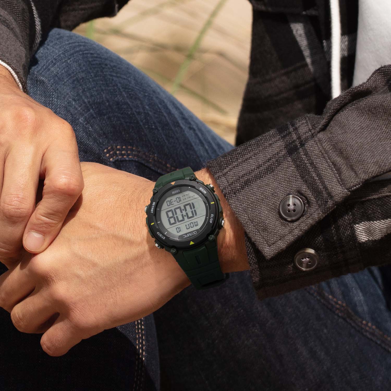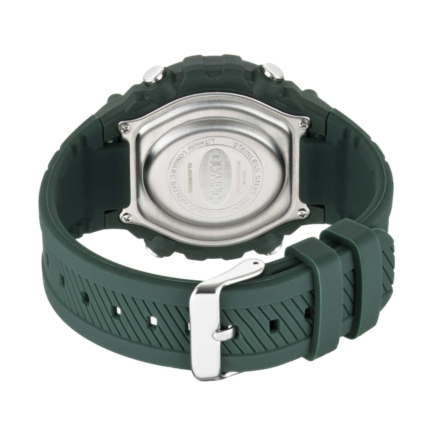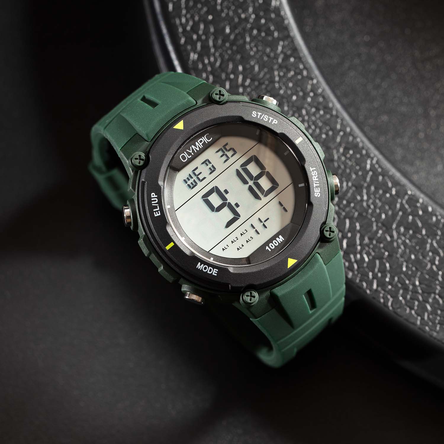 Olympic OL45HKR023 Digital Horloge Kids Groen/Zwa 46mm Dit unieke Olympic horloge met artikelnummer: OL45HKR023 is een digitaal kinder horloge met een sportieve uitstraling. De kunststof kast heeft 4 drukknoppen waarmee je de verschillende functies kan bedienen. De horloges zijn in verschillende kleur samenstellingen en verschillende grootte te krijgen. Het horloge heeft tijd,- datum,- dag,- aanduiding. Ook heeft het een timer, alarm en stopwatch functie. Dit geeft het horloge vele mogelijkheden. Aan de kast zit een gelijk gekleurde siliconen band met een gespsluiting. Het horloge heeft een kunststofglas, een doorsnee van 46mm en is 10ATM. Waterdichtheid 10ATM Dit horloge is bestand tegen water bij het zwemmen en douchen. Dit horloge is niet bestand tegen (grote) waterdruk dus je kunt er niet mee duiken. Het merk: Het Nederlandse horlogemerk Olympic levert stoere chronografen, slimline series, digitale uurwerken en elegante dameshorloges. De prijs-kwaliteitverhouding staat bij Olympic hoog in het vaandel met prijzen die uiteenlopen van € 34,95 tot en met € 159,00. 100% Nederlands ontwerp, waterdicht en standaard 3 jaar fabrieksgarantie. Specificaties: - Ronde kast Ø 46mm - Digitaal uurwerk - Siliconen band - Groen - 10ATM - Standaard 3 jaar fabrieksgarantie - Kunststofglas