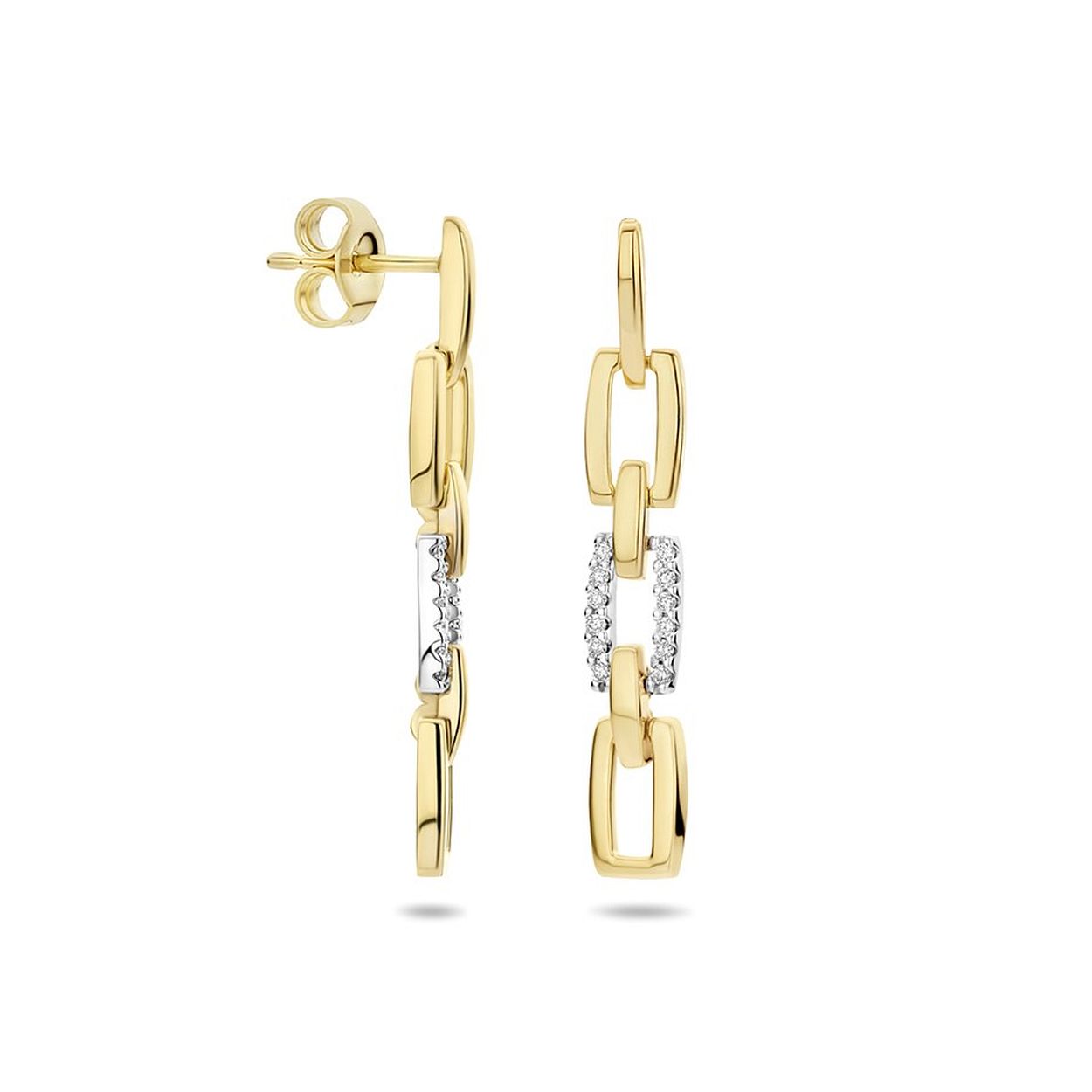 14k Bicolor geel- en witgouden oorhangers uitgevoerd met een schitterende diamant rij. De oorhangers hebben een afmeting van 30x5mm.