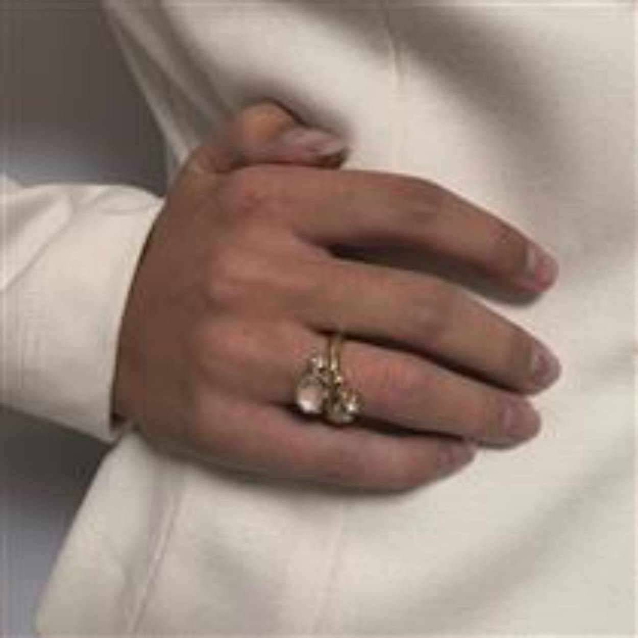 Deze sterling zilveren ring heeft in het midden een mooie prasioliet van 8 x 6 mm. Rondom de ringband bevinden zich twee witte topazen van 2,5 mm en één van 3 mm.