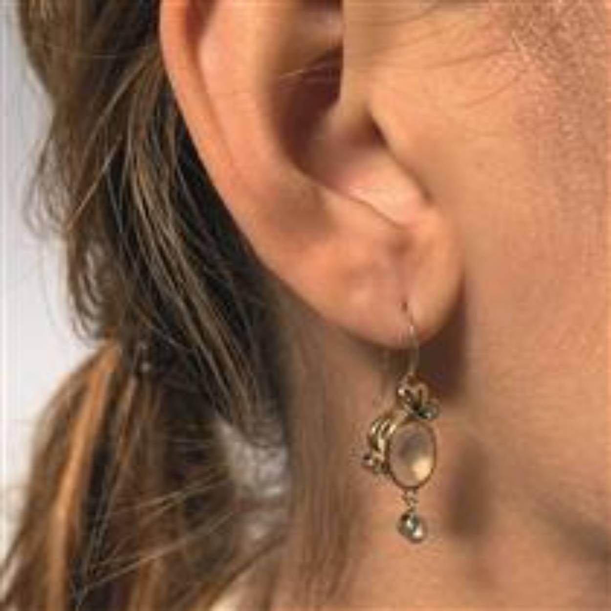 Deze geel goud vergulde oorbellen hebben elk een rozenkwarts van 8 x 6 mm en aan beide kanten een witte topaas van 2,5 mm. Onder de prasioliet hangt een witte topaas van 1,5 mm.