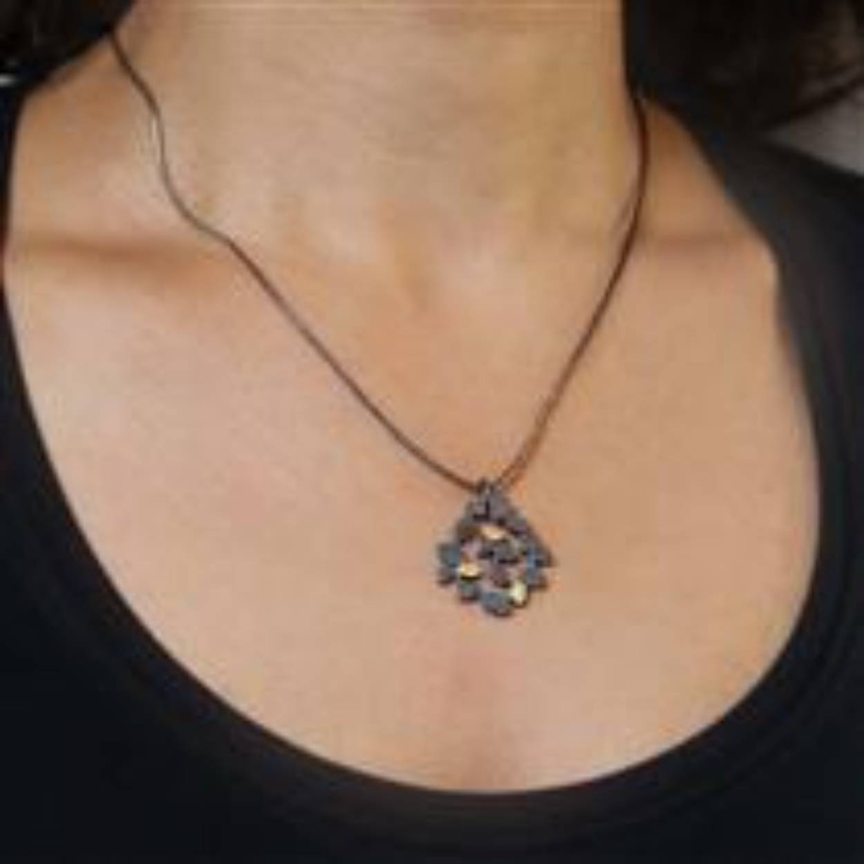 Deze sterling zilveren geoxideerde ketting heeft een hanger welke bestaat uit verschillende blaadjes. Drie blaadjes bevatten een laagje 14 karaat goud. De ketting kan op 45 cm gedragen worden.