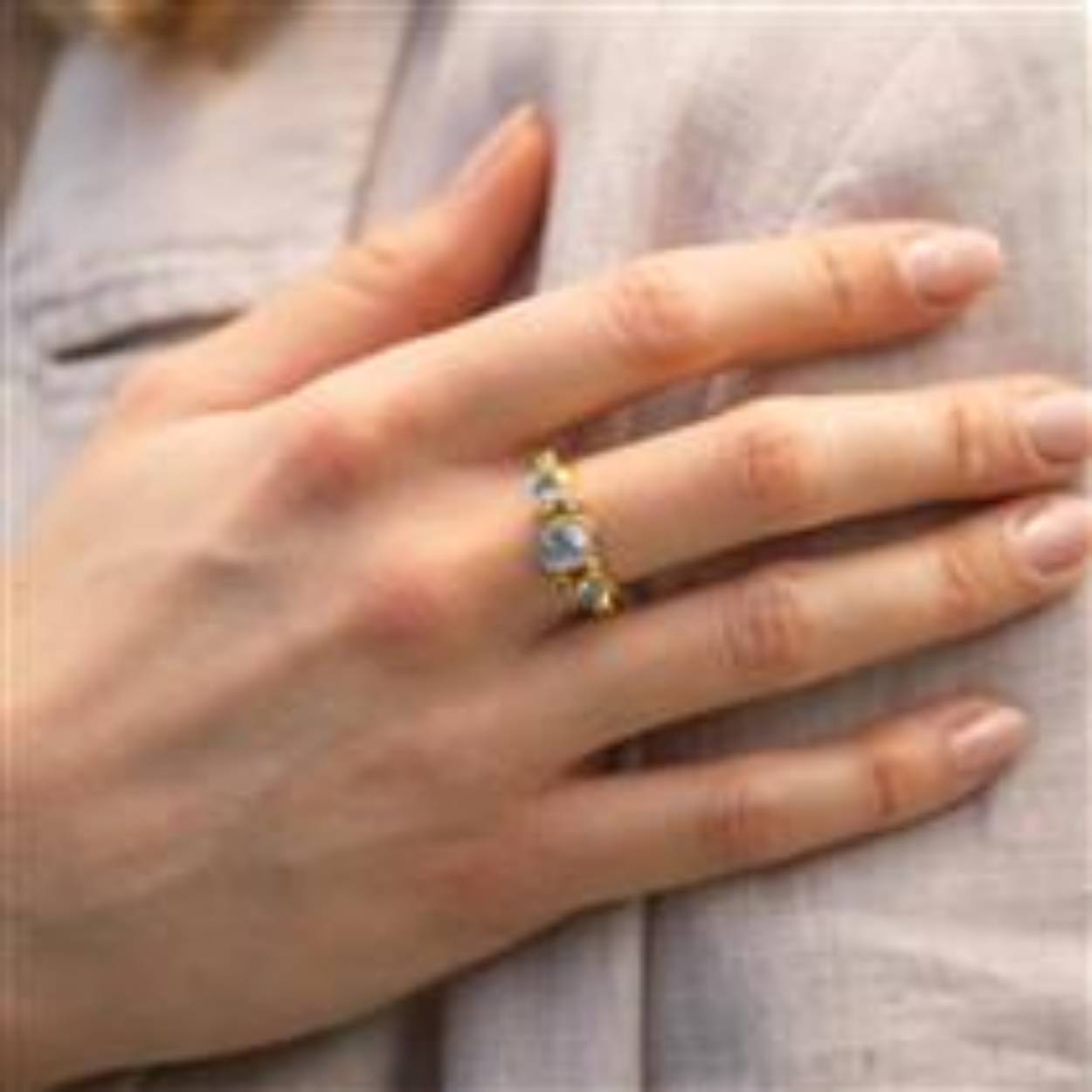 Deze geel goud vergulde ring heeft een 8 x 6 mm maansteen, een 5 x 3 gefacetteerde blauwe topaas, een 6 x 4 mm gefacetteerde blauwe topaas, een 2,5 mm ronde gefacetteerde blauwe topaas, een 2 mm ronde gefacetteerde blauwe topaas, een 2 mm ronde zirkonia en een 1,5 mm ronde zirkonia.