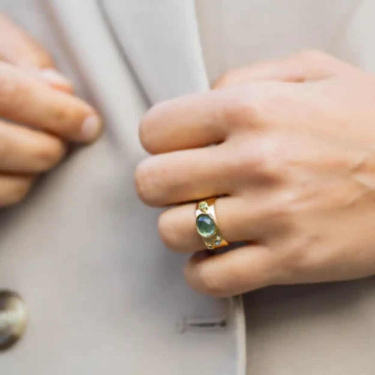 Deze geel goud vergulde ring heeft een mooie 8 x 7 mm roosgeslepen niervormige blauwe kwarts, een 3 mm gefacetteerde peridoot, een 2,5 mm blauwe topaas en een 1,5 mm zirkonia.