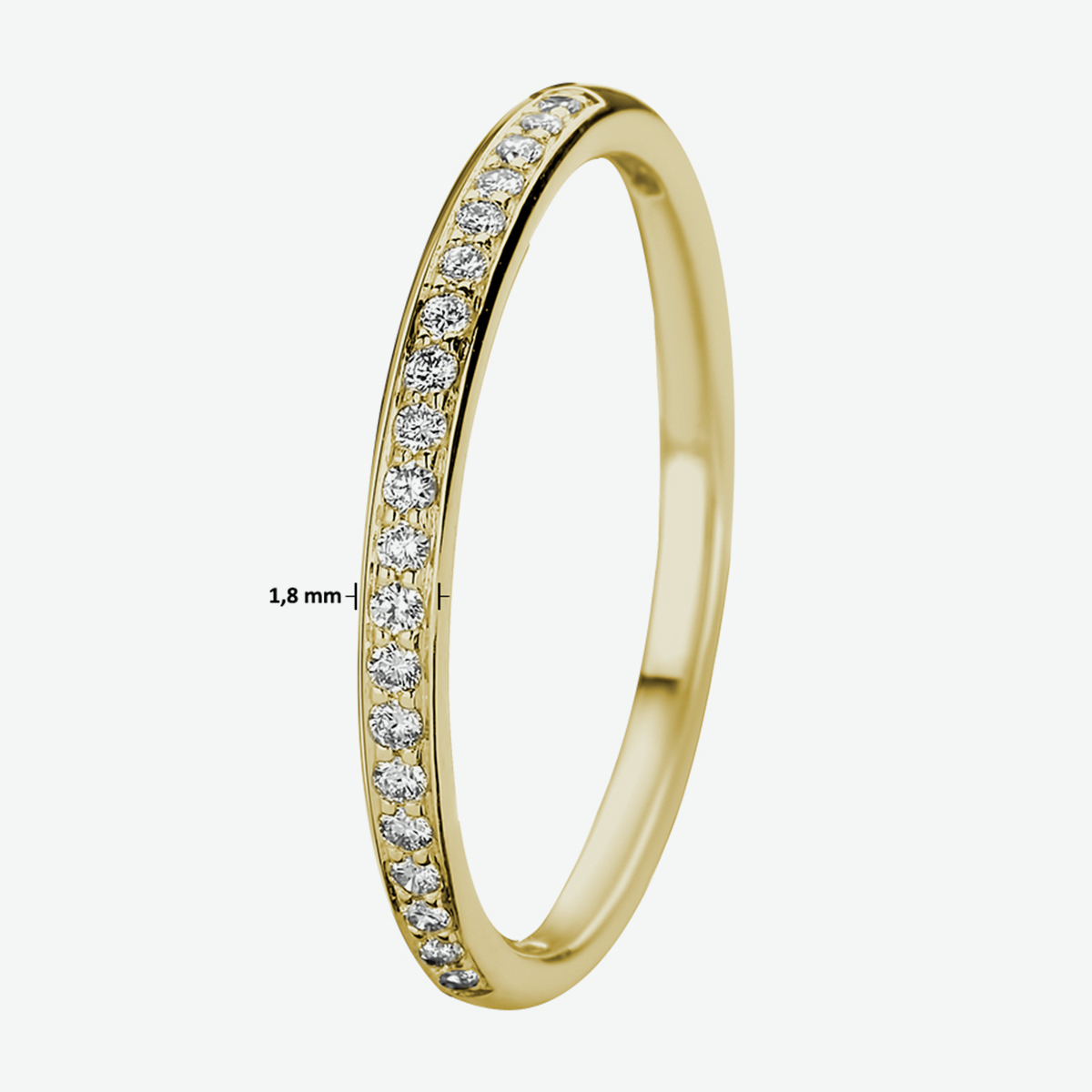 14k Geelgouden ring uitgevoerd met een schitterende diamant rij. De ring heeft een breedte van 1.8mm.