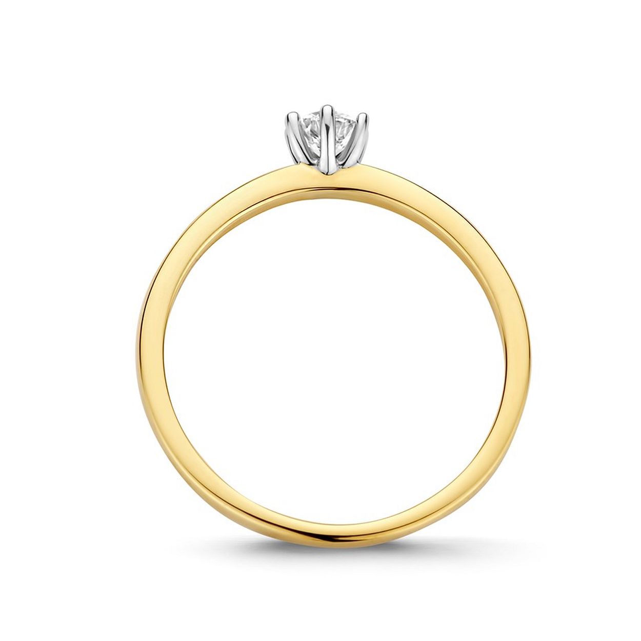 14k Bicolor geel- en witgouden ring uitgevoerd met een schitterende diamant. De ring heeft een breedte van 4.5mm.