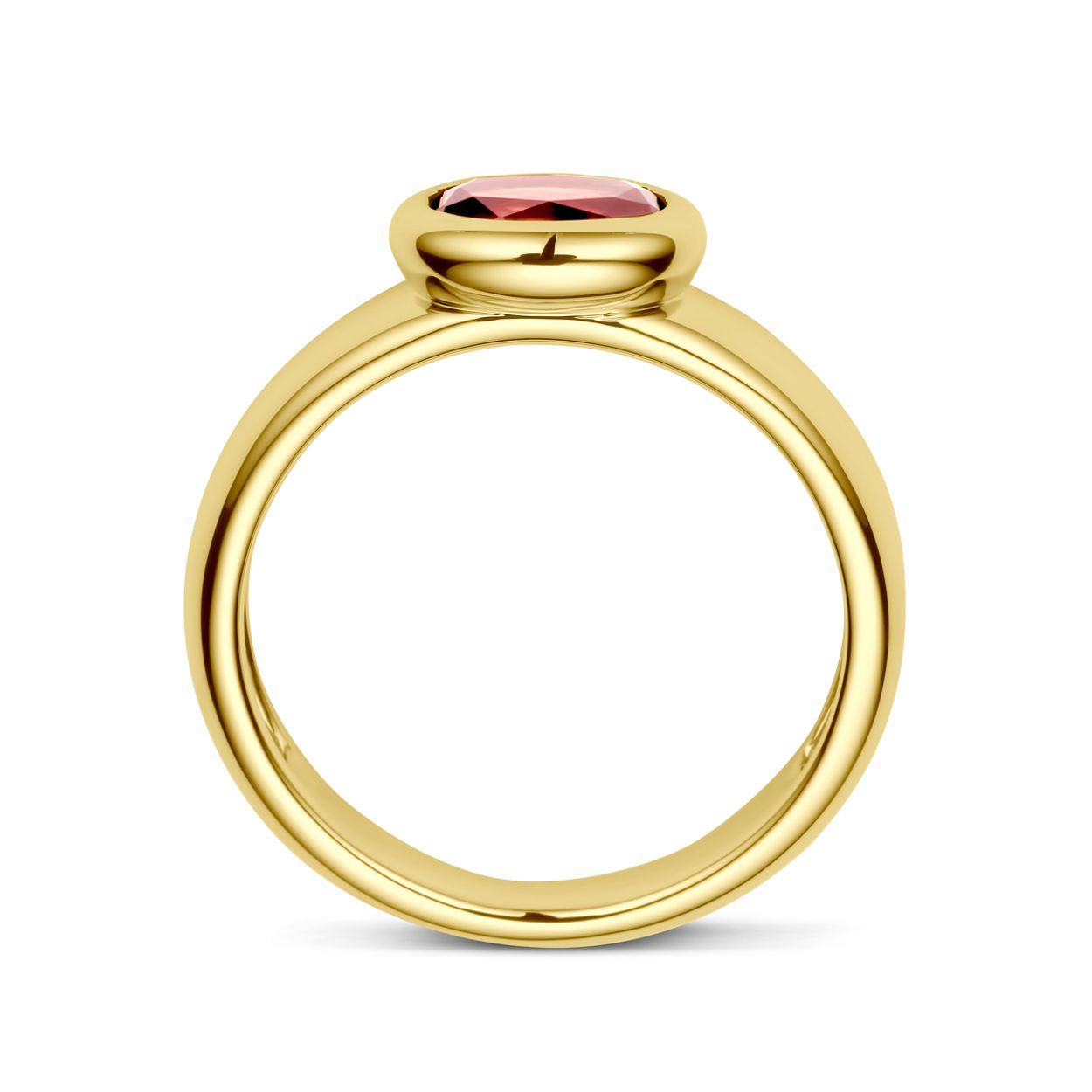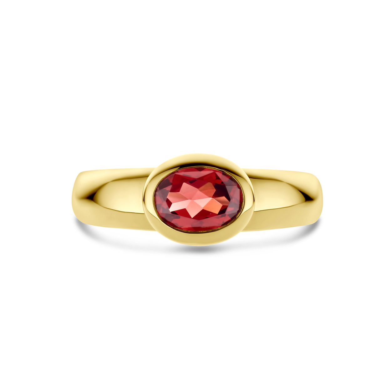 14k Geelgouden ring uitgevoerd met granaat. De ring heeft een afmeting van 7.5x9mm.