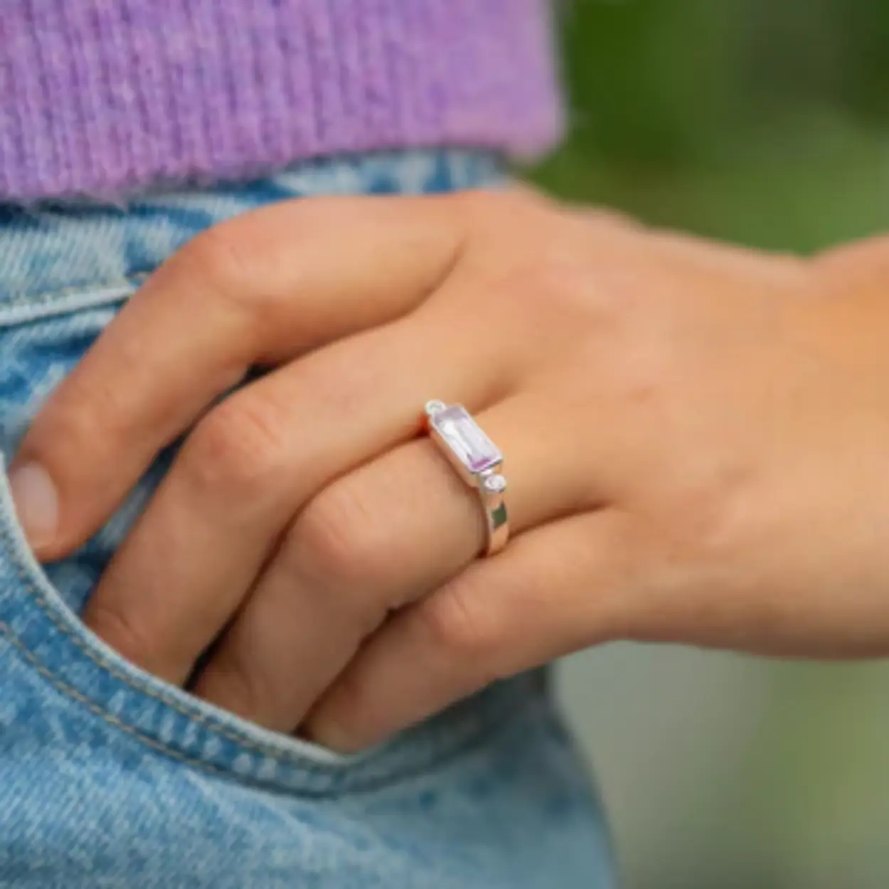 Deze sterling zilveren ring heeft een mooie 10 x 4 mm amethist octagon facetgeslepen en aan beide kanten een 2 mm ronde zirkonia.