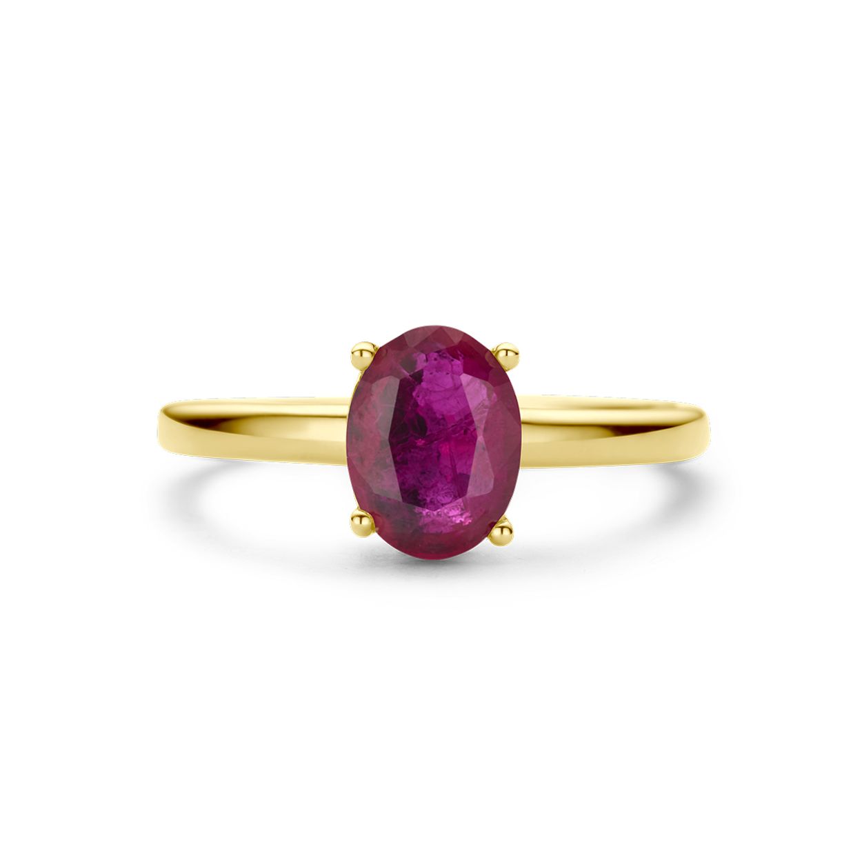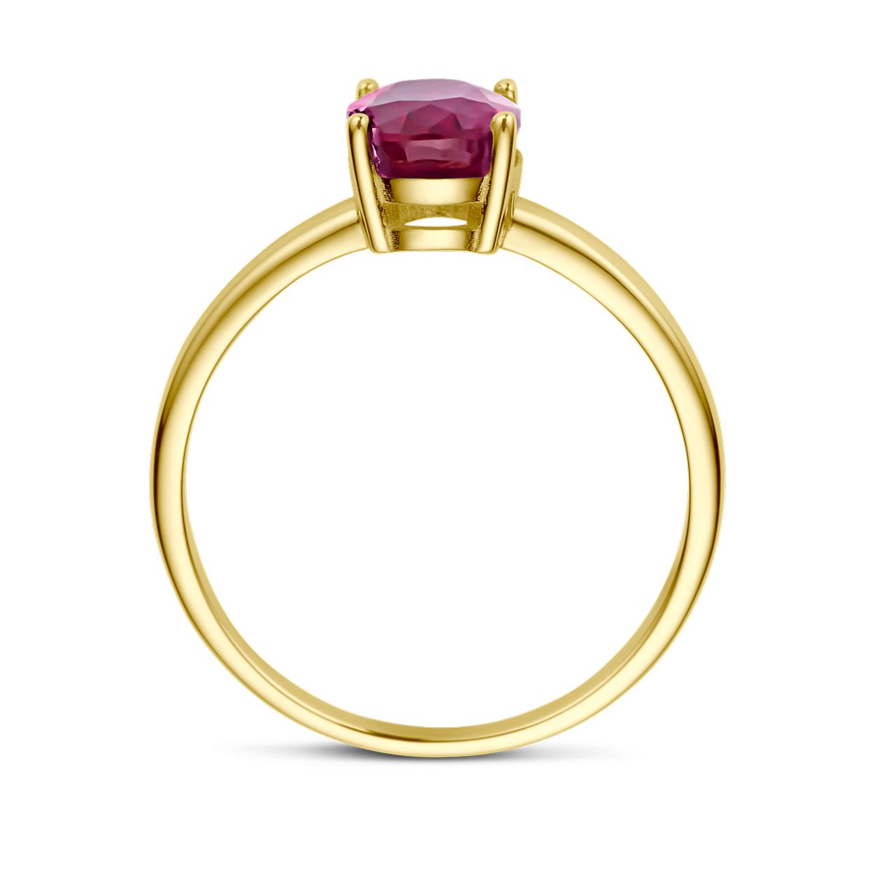 14k Geelgouden ring uitgevoerd met robijn. De steen heeft een afmeting van 8x6mm.