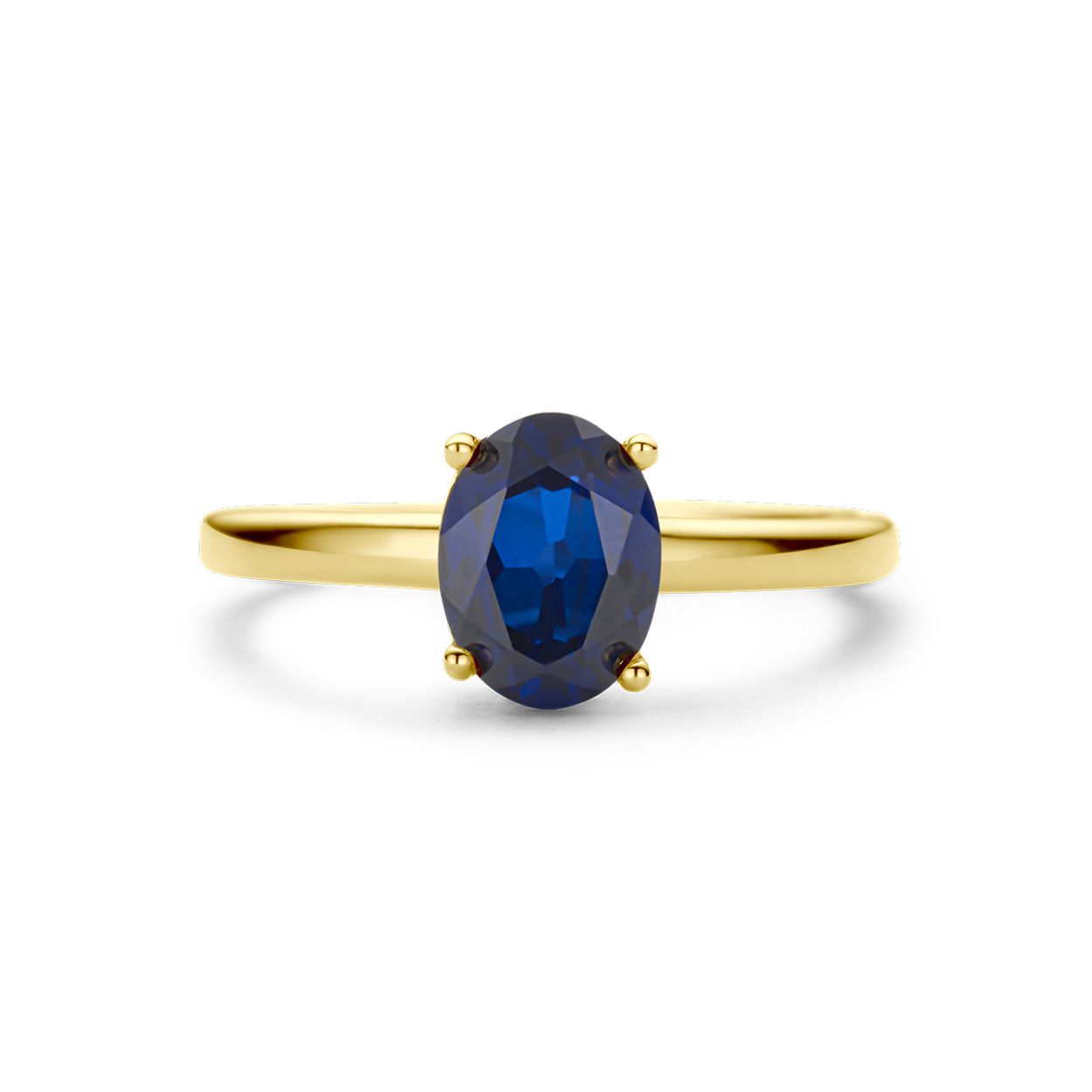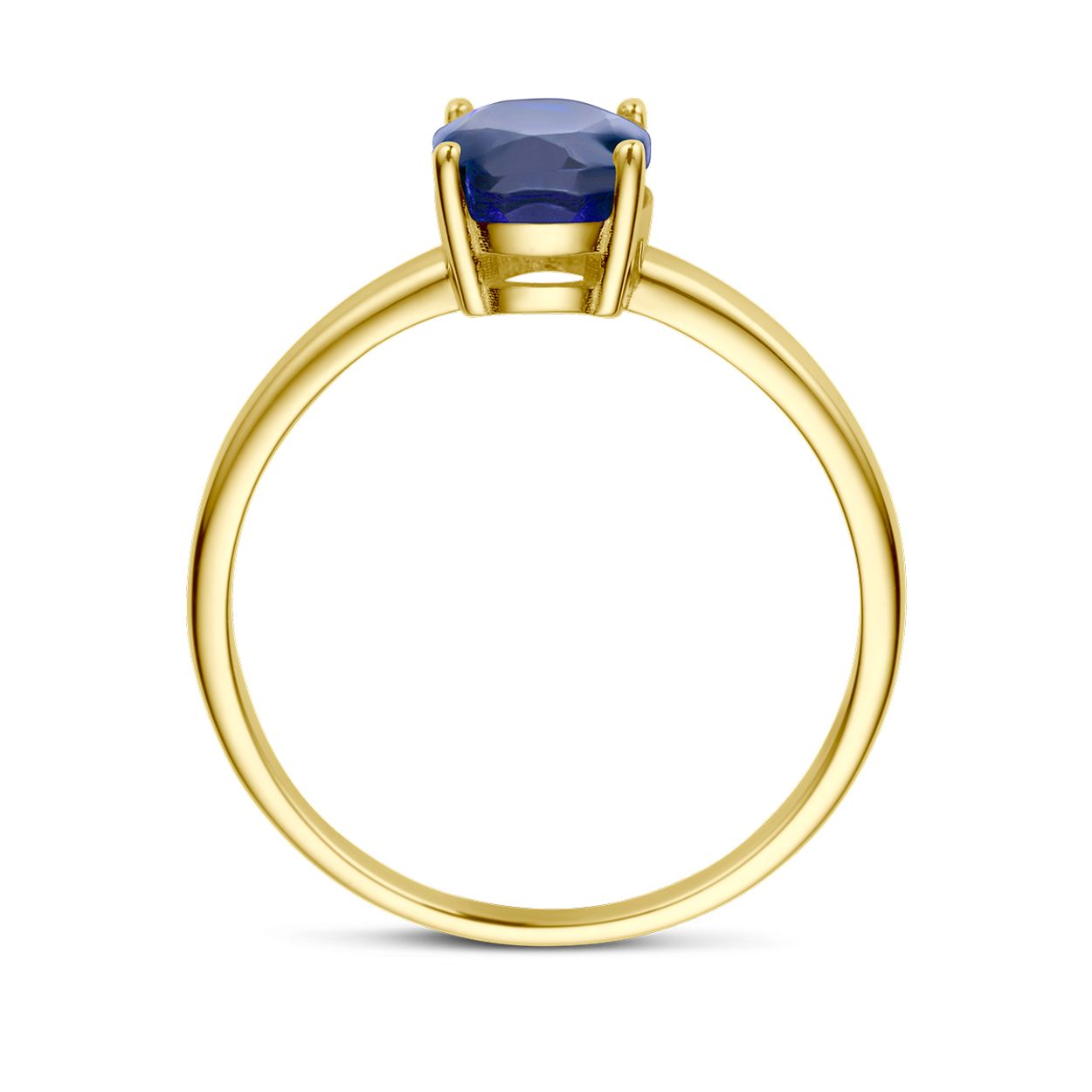 14k Geelgouden ring uitgevoerd met blauw saffier. De steen heeft een afmeting van 8x6mm.