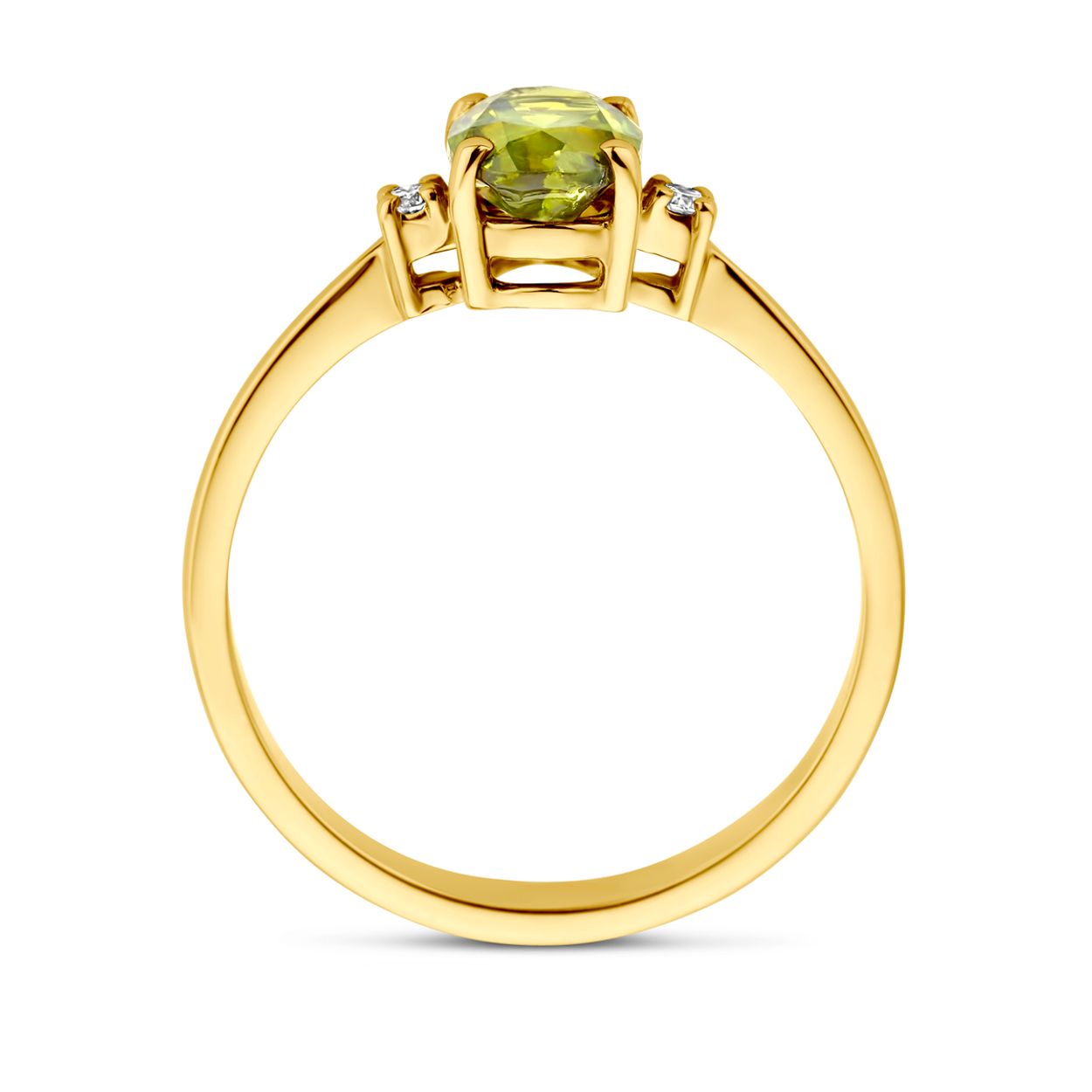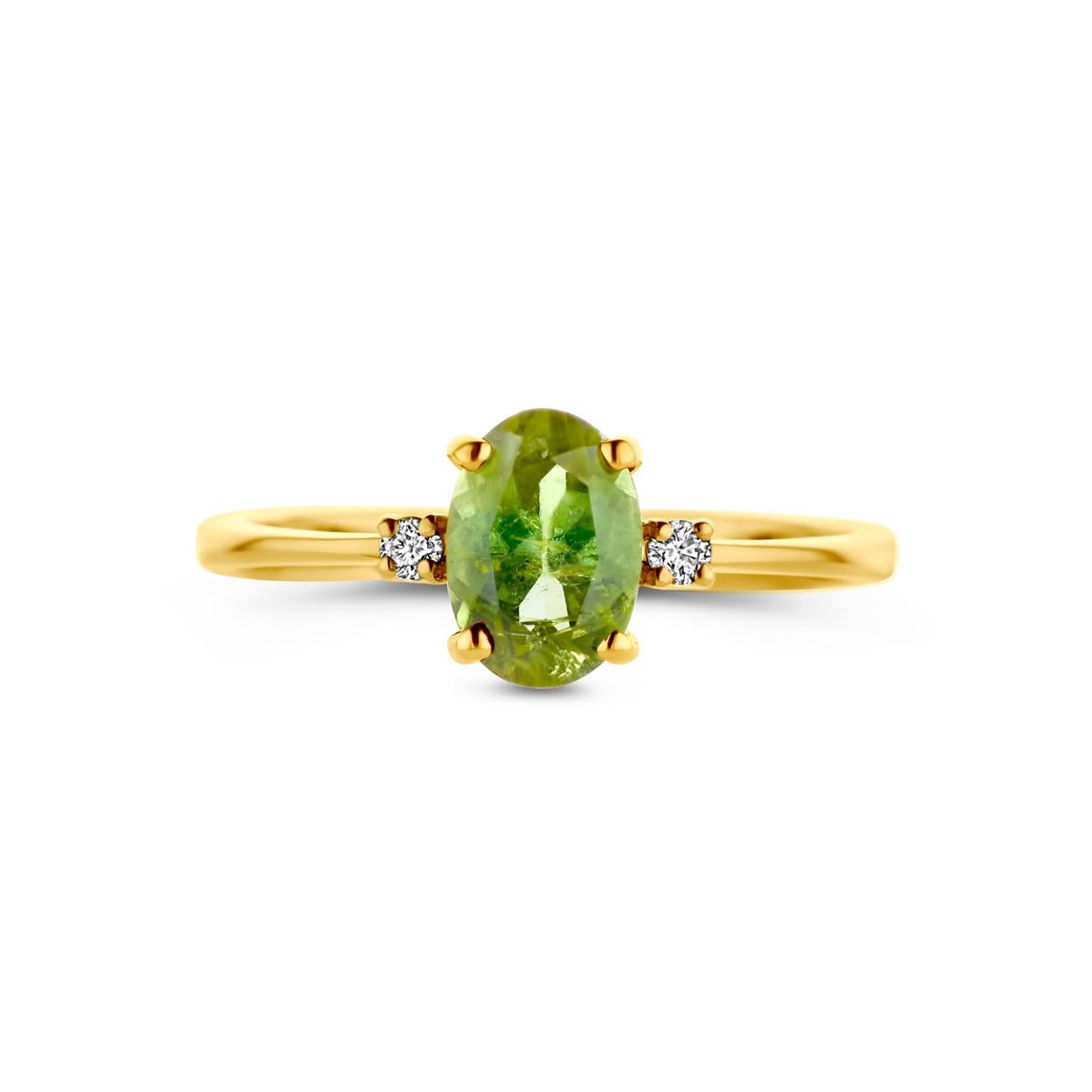 14k Geelgouden ring uitgevoerd met toermalijn en diamant. De ring heeft een afmeting van 7x5mm. Het diamantgewicht is 0.04ct.