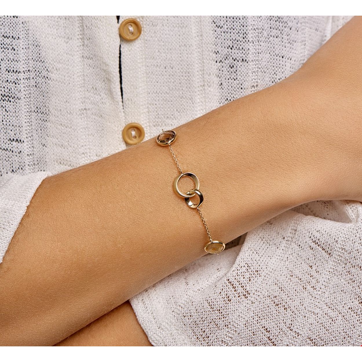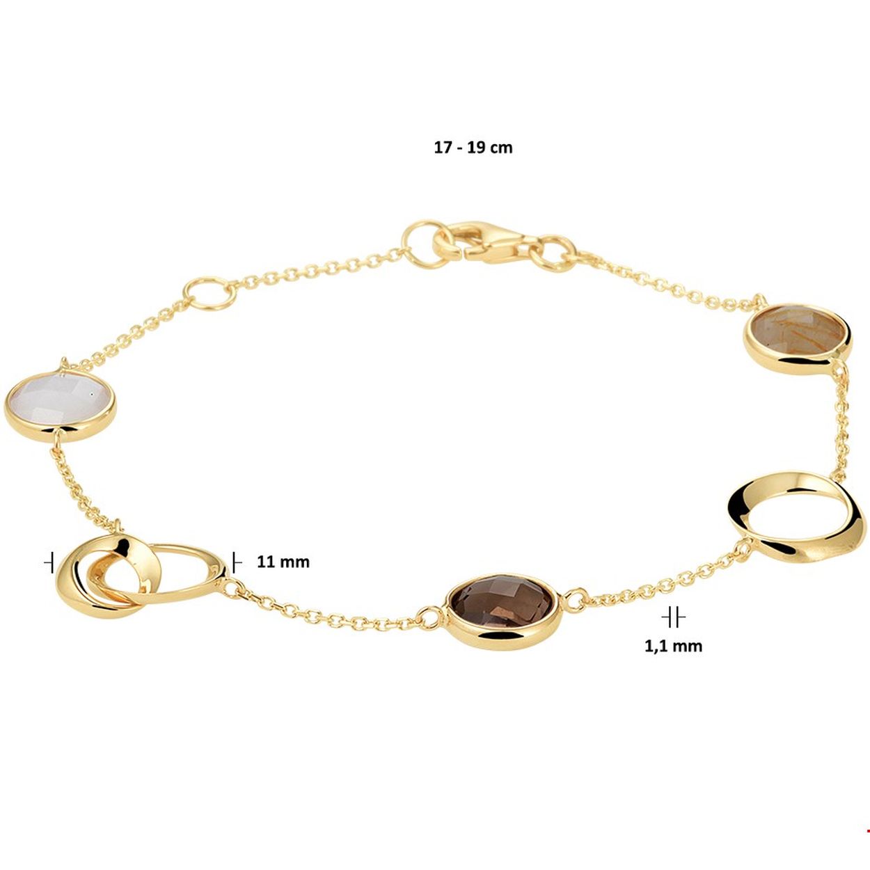 Beschrijving: Een prachtige armand met kleurstenen en 14k geelgouden schakels. In de armband zijn drie soorten edelsteen verwerkt: goud rutiel, rookkwarts en wit kwarts. De stenen zijn in een zetkast geplaatst. De armband heeft een lengte van 17-19 cm en is het op het breedste punt 11mm breed. Het sluit met een stevig karabijnslot.