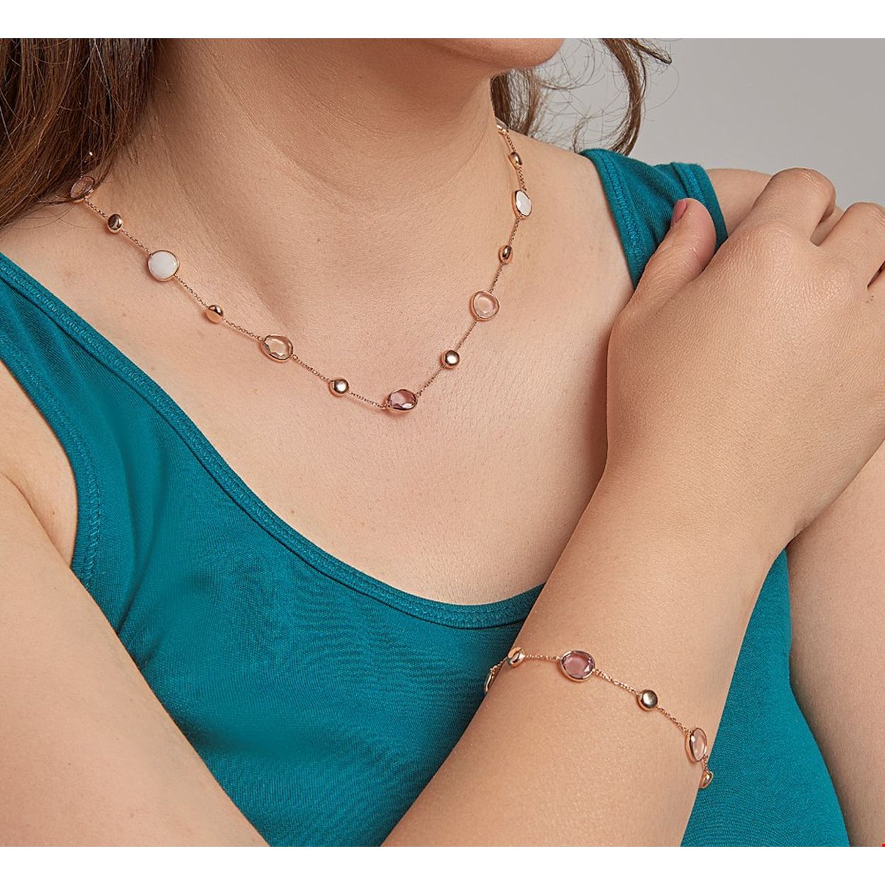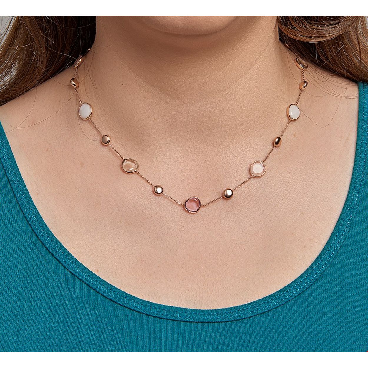 Beschrijving: 14k Rosegouden collier met schitterende edelstenen zoals: groen amethyst, amethyst, wit jade en roze kwarts. Het collier heeft draaglengtes van 43 en 46cm. Uitgevoerd met een karabijn sluiting.