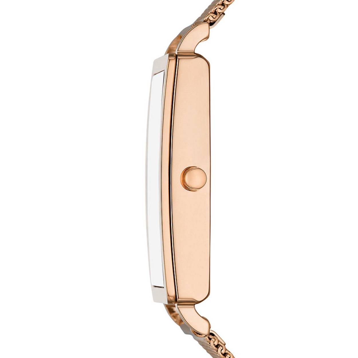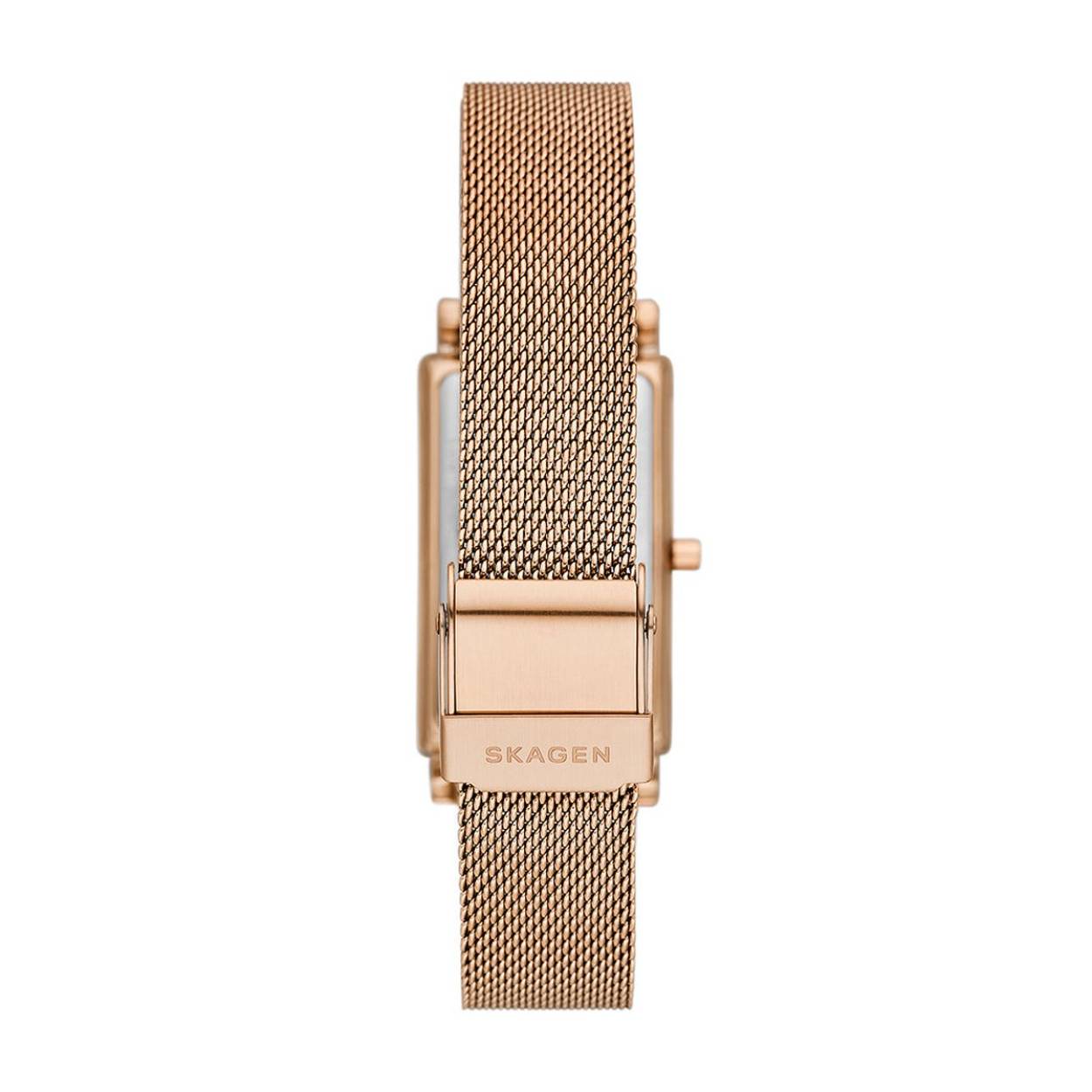 Deze Hagen heeft een tankkast van 43 x 22 mm met een witte gezandstraalde wijzerplaat, uurwerk met drie wijzers en een roségoudkleurig roestvrijstalen mesh bandje. Het horlogebandje is verwisselbaar.