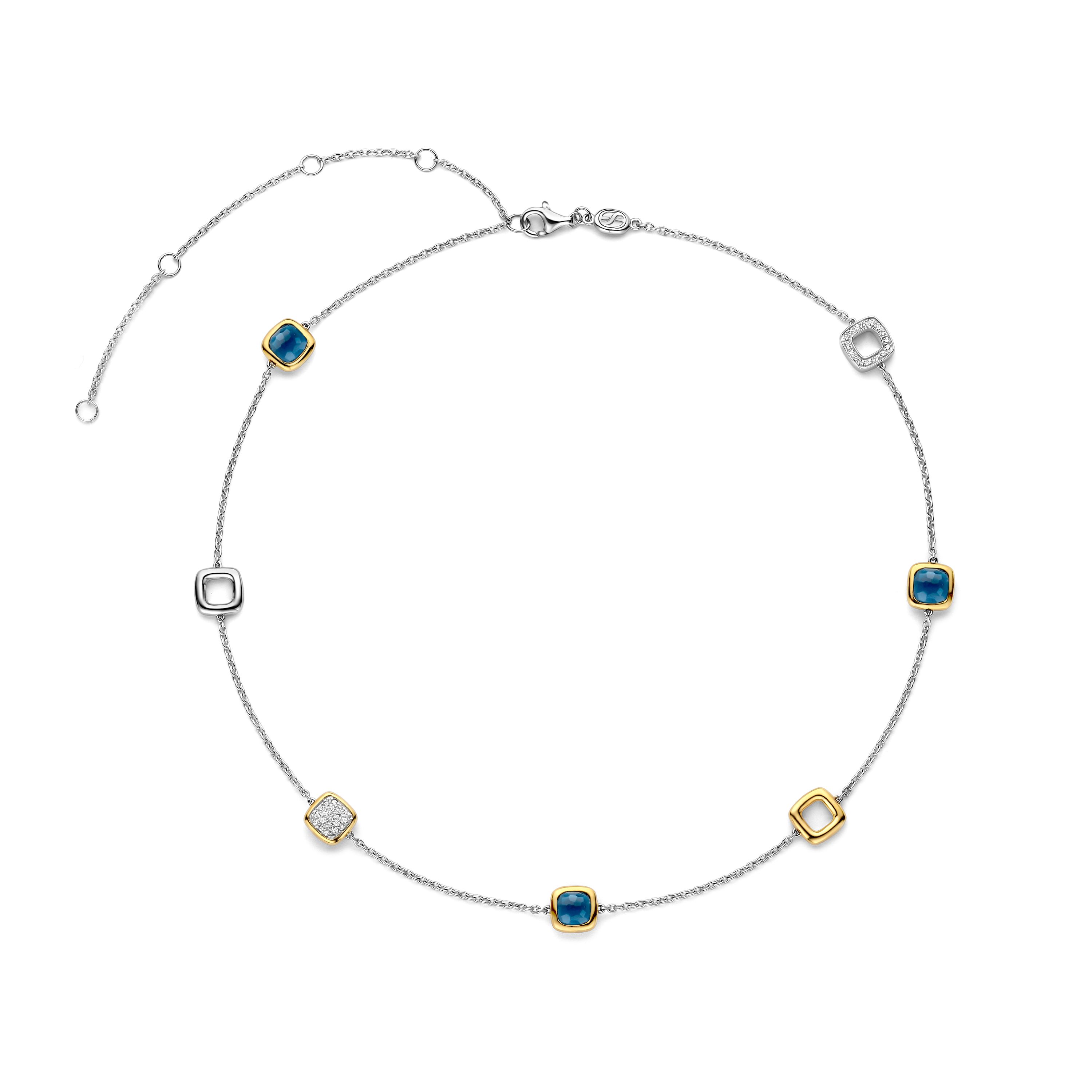Diepblauwe stenen, gezet in stralende goudgekleurde omlijstingen, brengen een rijke intensiteit in het ontwerp, terwijl open kussenvormen en pav�-set cubic zirconia accenten textuur en moderne intrige toevoegen. Het samenspel van solide en open vormen cre�ert een ritme van licht en schaduw, waardoor diepte en dimensie aan de slanke silhouet van de ketting wordt toegevoegd.