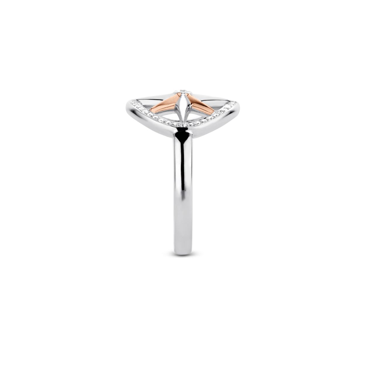 Deze zilveren TI SENTO - Milano ring 12155ZR met haar ros� goud vergulde windroos en witte zirkonia stenen is een prachtige verschijning. Laat haar je de weg wijzen.