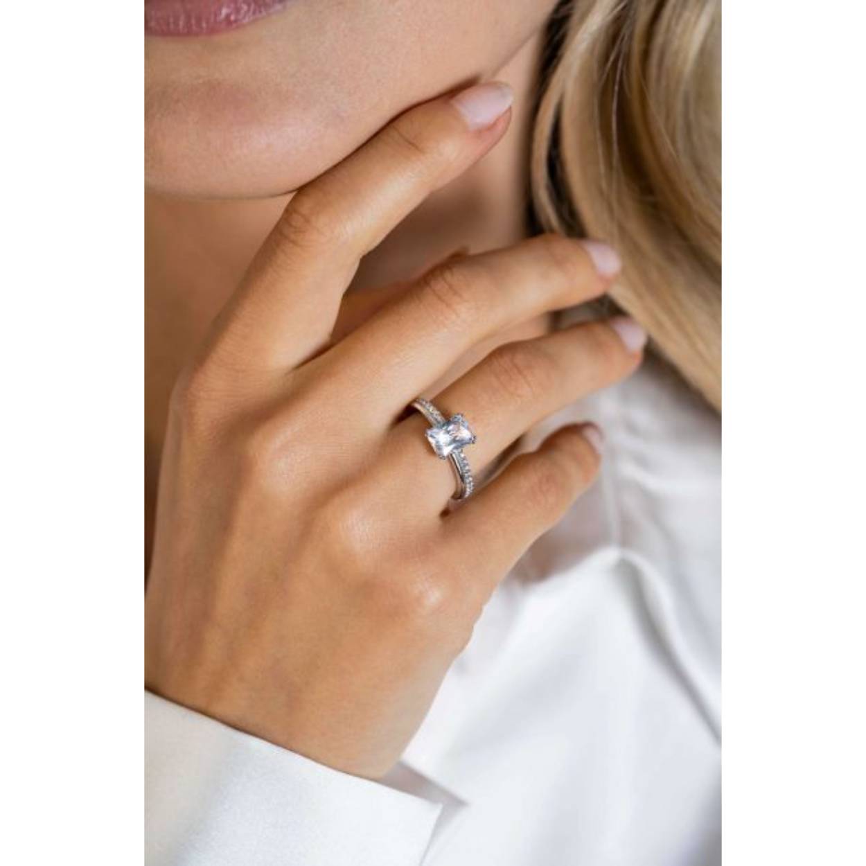 ZINZI zilveren luxe ring met rechthoekige witte zirconia in een vierpoots-zetting. De scheen heeft een multi-look uitstraling. ZIR2392